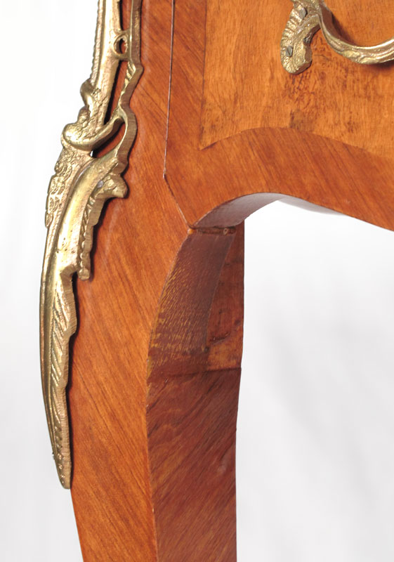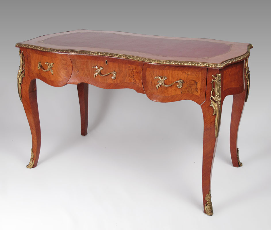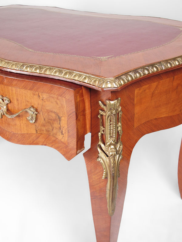 LOUIS XVI STYLE LEATHER TOP DESK: Gold embossed red leather top, 3 drawers, ormolu mounts. Late 20th C. Approx. 30'' tall x 32'' x 50''.