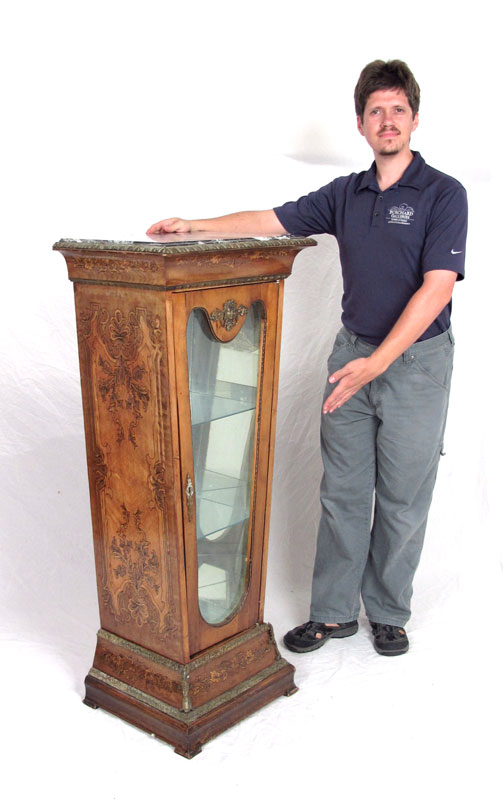 FRENCH STYLE PEDESTAL CURIO DISPLAY STAND: Marble top on a columnar glass front display stand. Painted faux inlay design. Gilt metal mounts. Measures approx. 50'' tall x 23'' x 15''.
