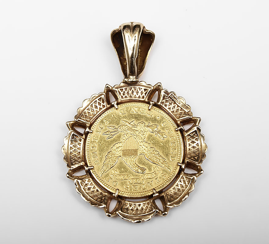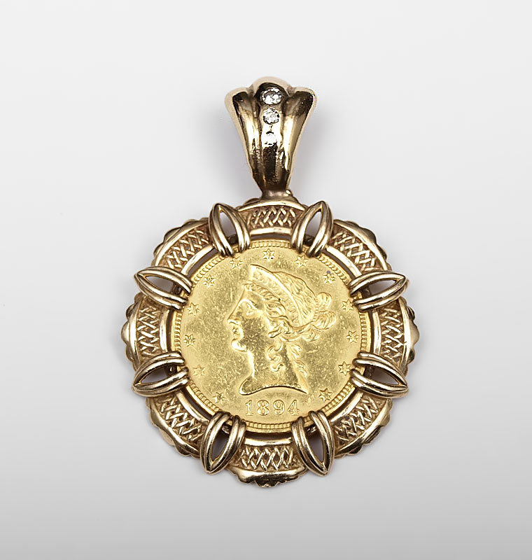 1894 GOLD $10 LIBERTY HEAD COIN PENDANT: Framed in a 14K frame with three round brilliant cut diamonds totaling approx. .17 Ct., rated SI in clarity and H-I in color. 26.7 grams all inclusive.
