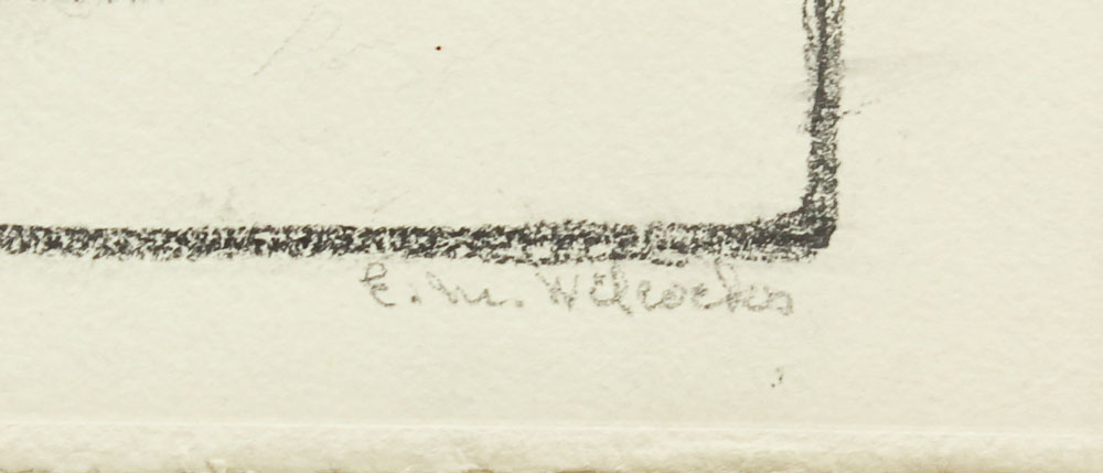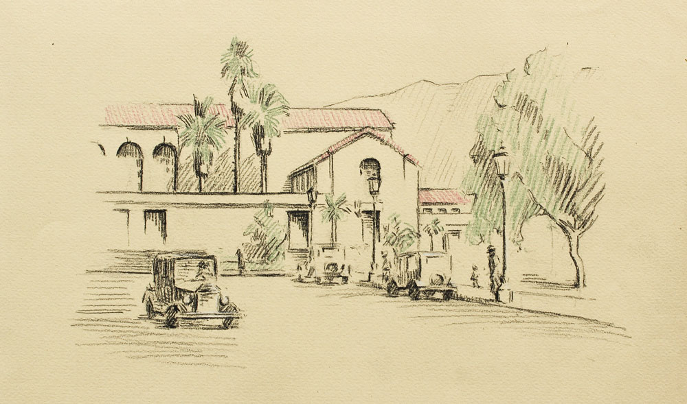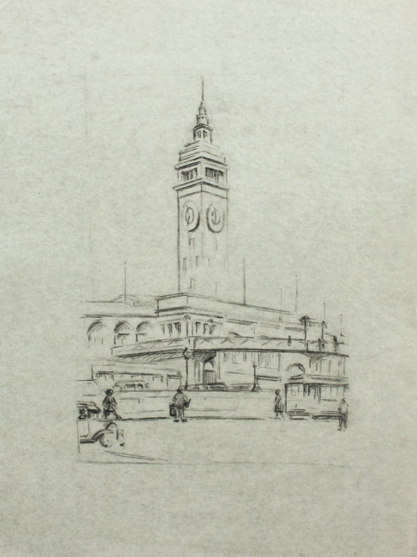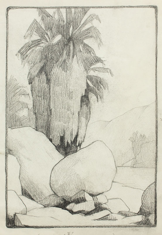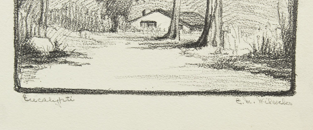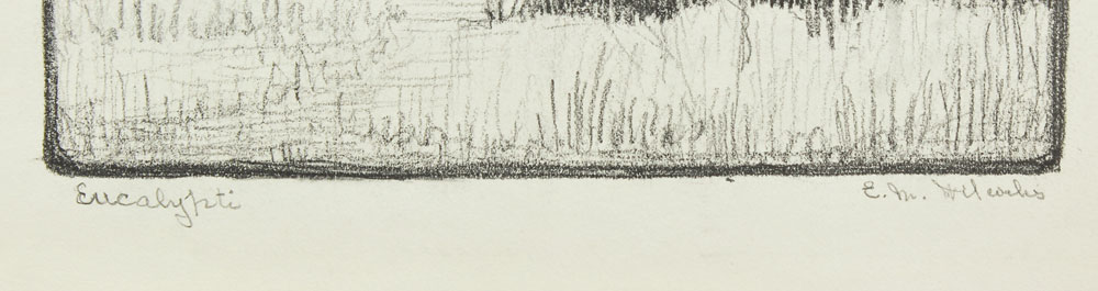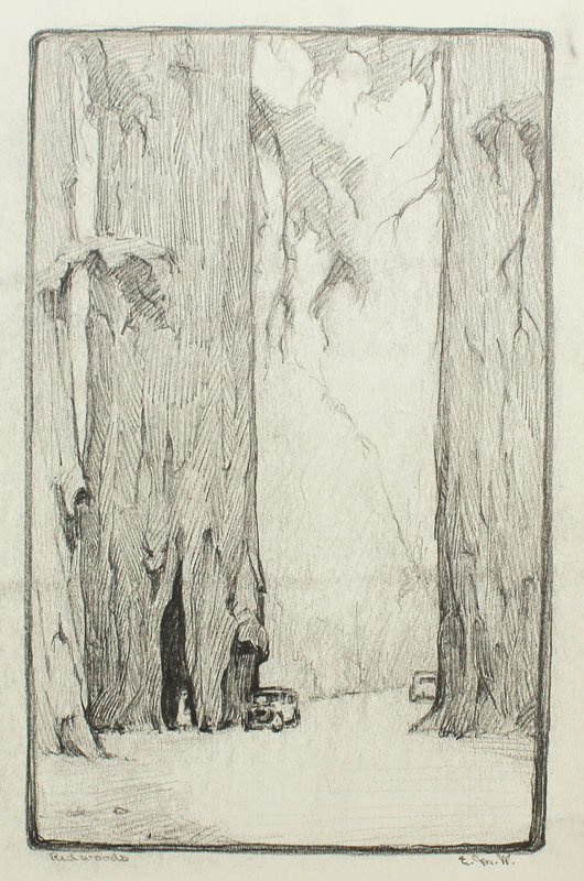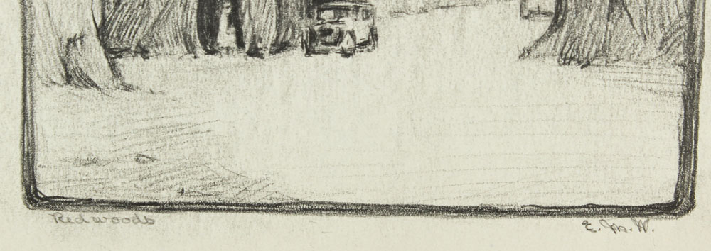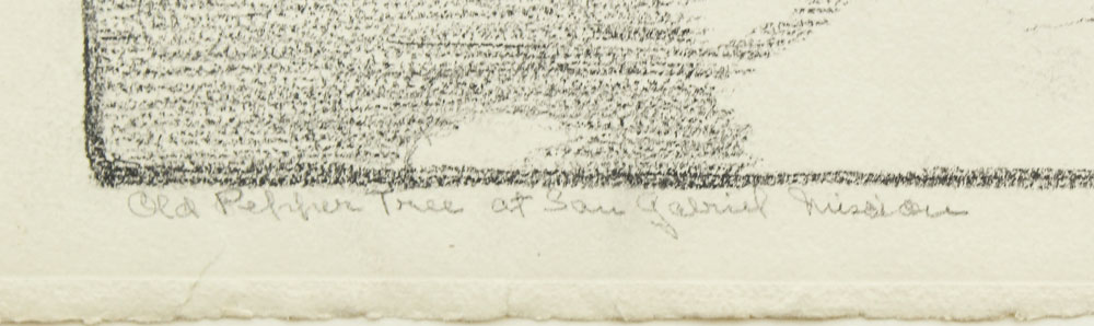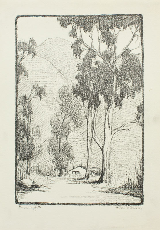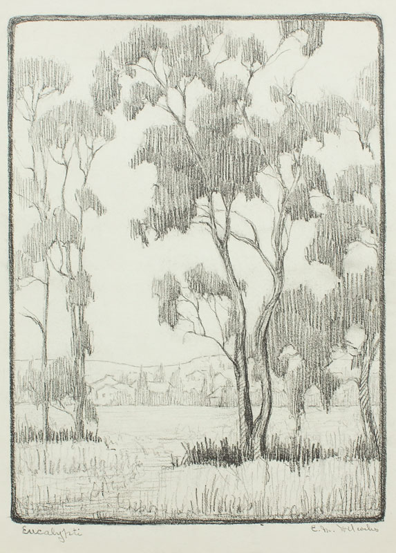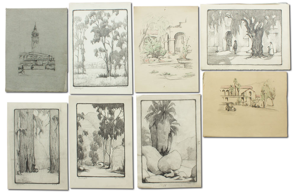 WILCOCKS, Edna Marrett, (American, 1887-1969): Collection of 8 drawings to include; ''Eucalyptus'': 10 3/4'' x 7 3/4'', pencil signed lower right, titled lower left, unframed, paper size with margins 12 3/4'' x 9''. ''Redwoods'': Image size 10 1/4'' x 6 1/2'', monogrammed lower right, titled lower left, unframed size with margins, 12 1/4'' x 8 3/4''. Urban Scene with Clock Tower: Total size is 12'' x 9'', unsigned, condition several minor tears in the margin. ''Old Peppertree at San Gabriel Mission'': Image size 7 1/2'' x 10 1/2'', signed lower right, titled lower left, unframed size with margins, 9'' x 12 3/4'', condition several small tears in the lower left margin. ''Mission San Juan Capistrano'': Colored pencil drawing, 12'' h., 9'' w., unframed, not monogrammed, condition pinholes in corners, and several blemishes in upper and lower margins. Colored Pencil drawing of a California Mission: 9'' x 12'' paper size, unsigned, unframed. ''Eucalyptus'': Pencil drawing, image size 10'' x 6 3/4'', signed lower right, titled left, size of margins 12 3/4'' x 9''. Rocky Landscape with Palm: Image size 11'' x 7 3/4'', unsigned, unframed, with margins 12 3/4'' x 9''. Sold as a lot.