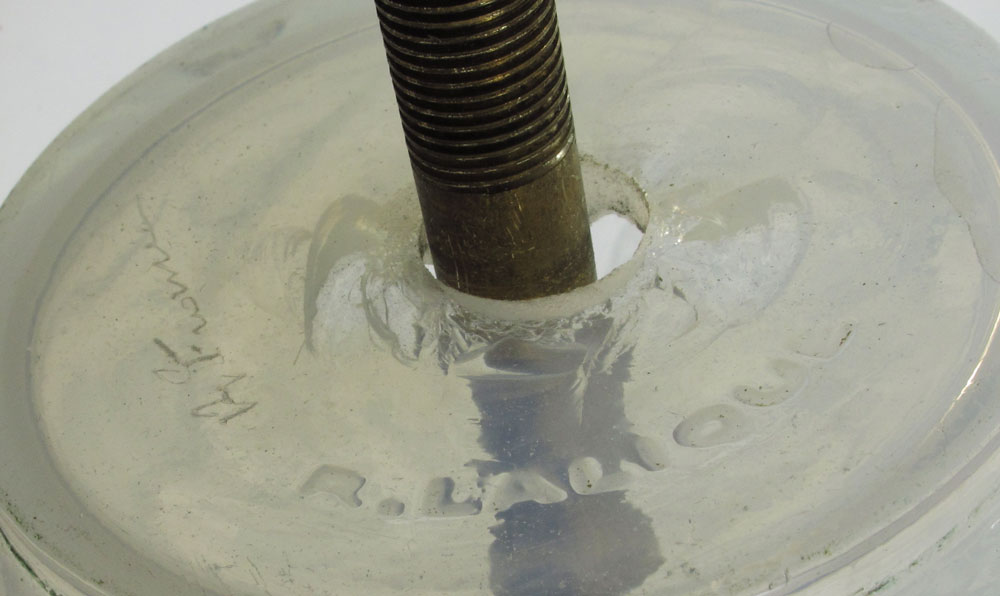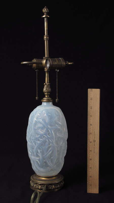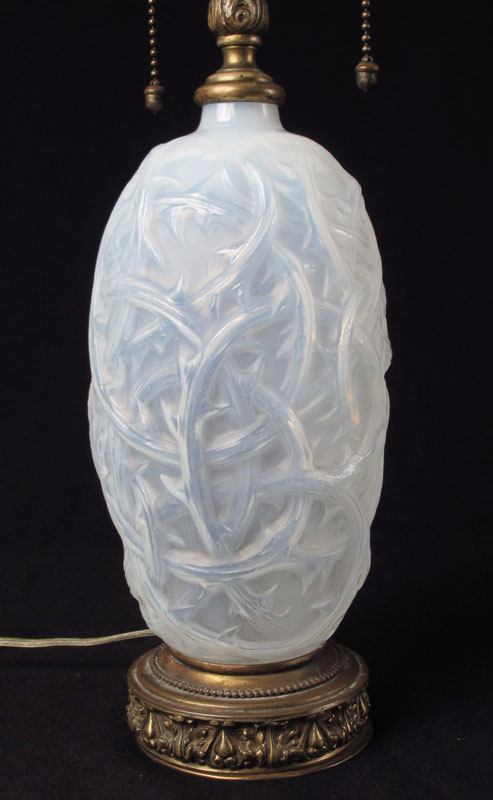 LALIQUE IRIDESCENT RONCES VASE CONVERTED TO LAMP: Vase 9'' h. x 4 3/4''. Molded R. Lalique and etched France signed on base of vase. Overall 22'' h.