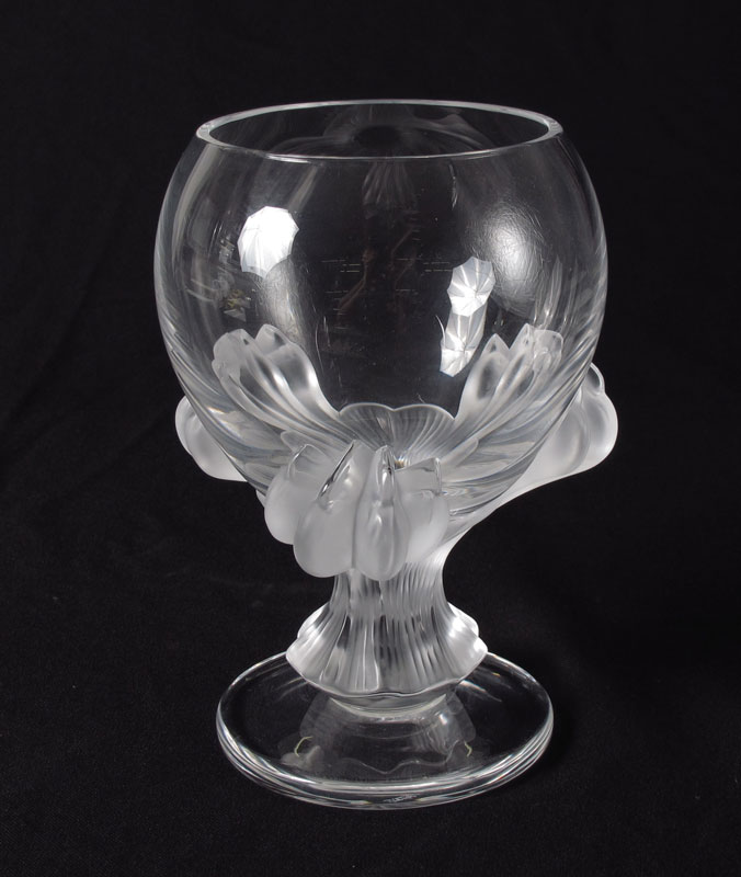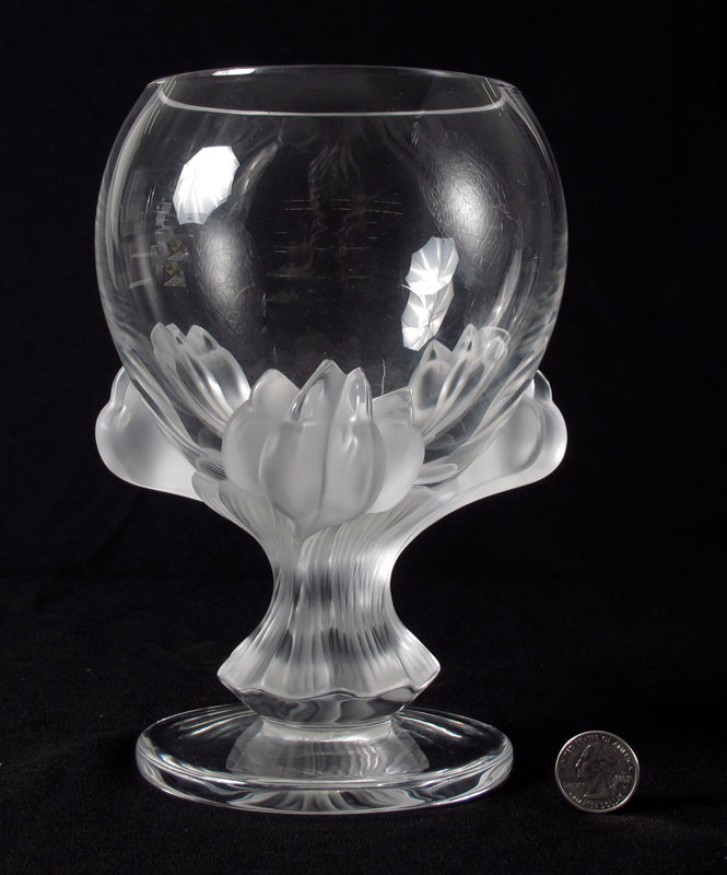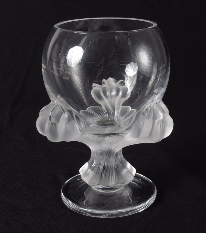LALIQUE FRENCH CRYSTAL ''BAGHEERA'' LION PAW VASE: Frosted paws under the clear bowl vase, signed in script. Approx. 8 1/2'' tall, the base 6'' dia.