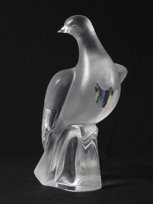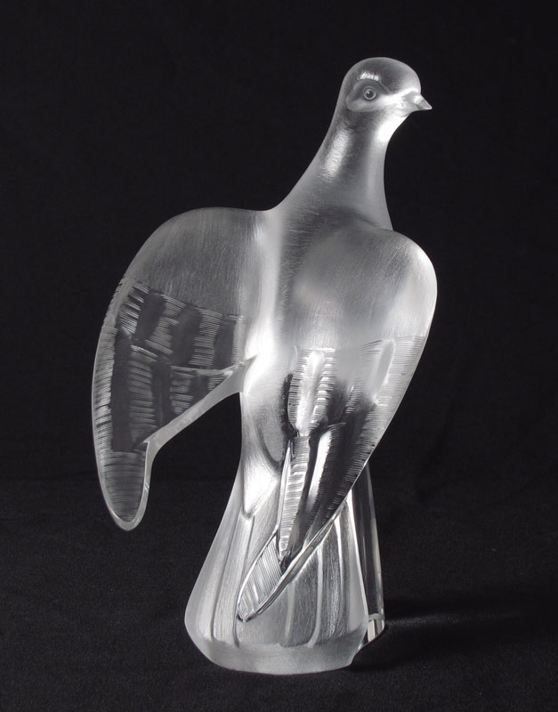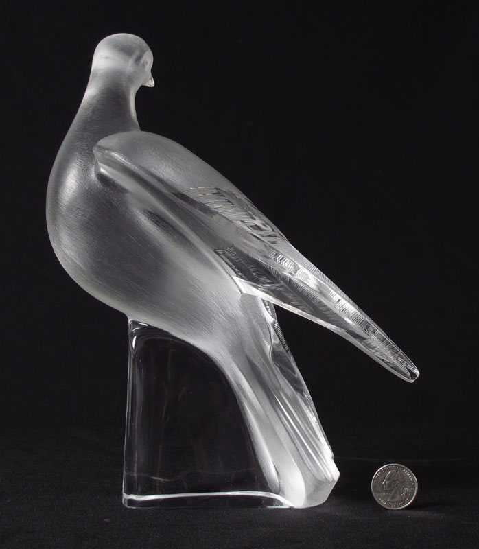 MARIE-CLAUDE LALIQUE DOVE ''CHARIS'' FIGURINE: From the 1970's Dove Series of Three, design #11635 clear, frosted and textured glass, signed Lalique France, approx. 10 1/4'' x 6'' x 7 1/2''.