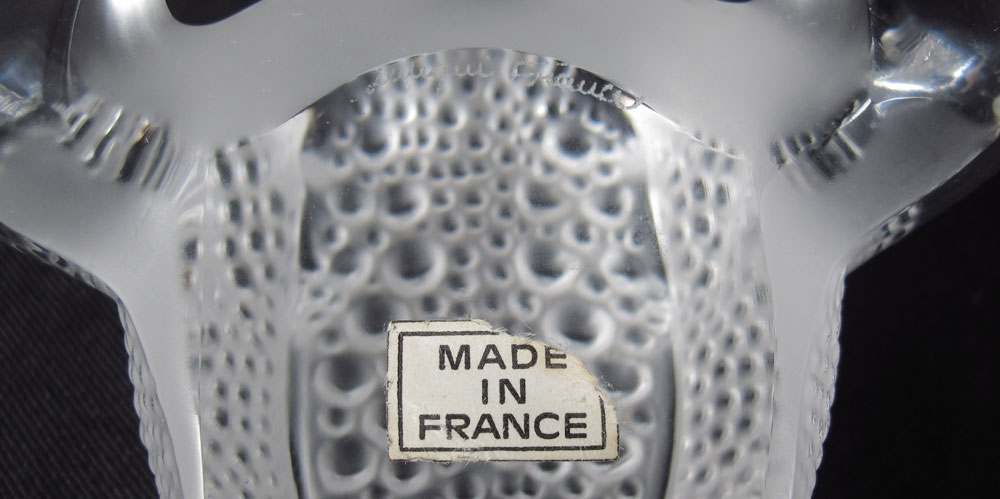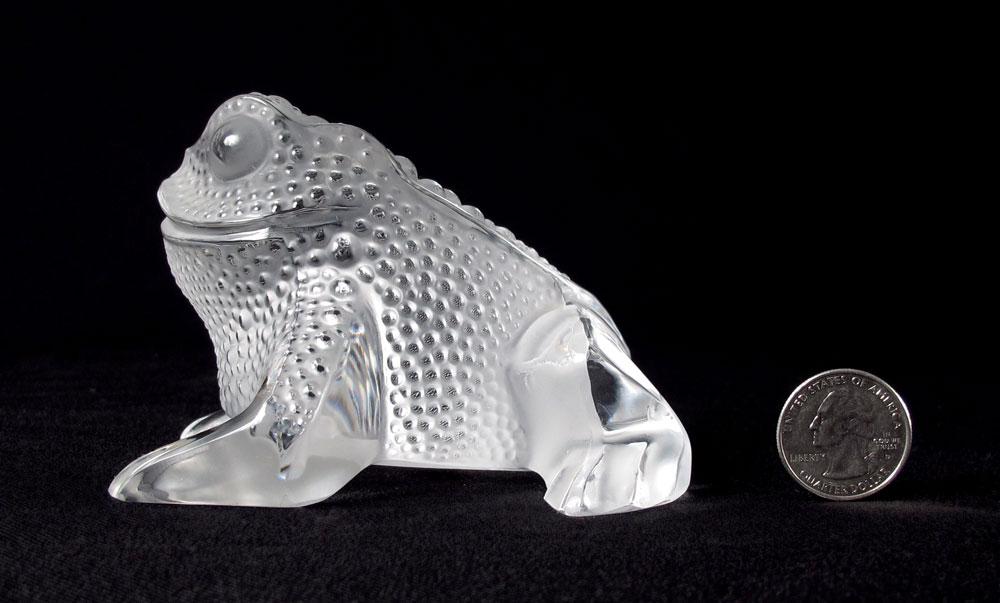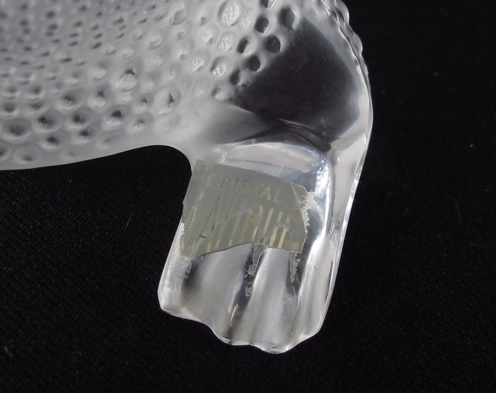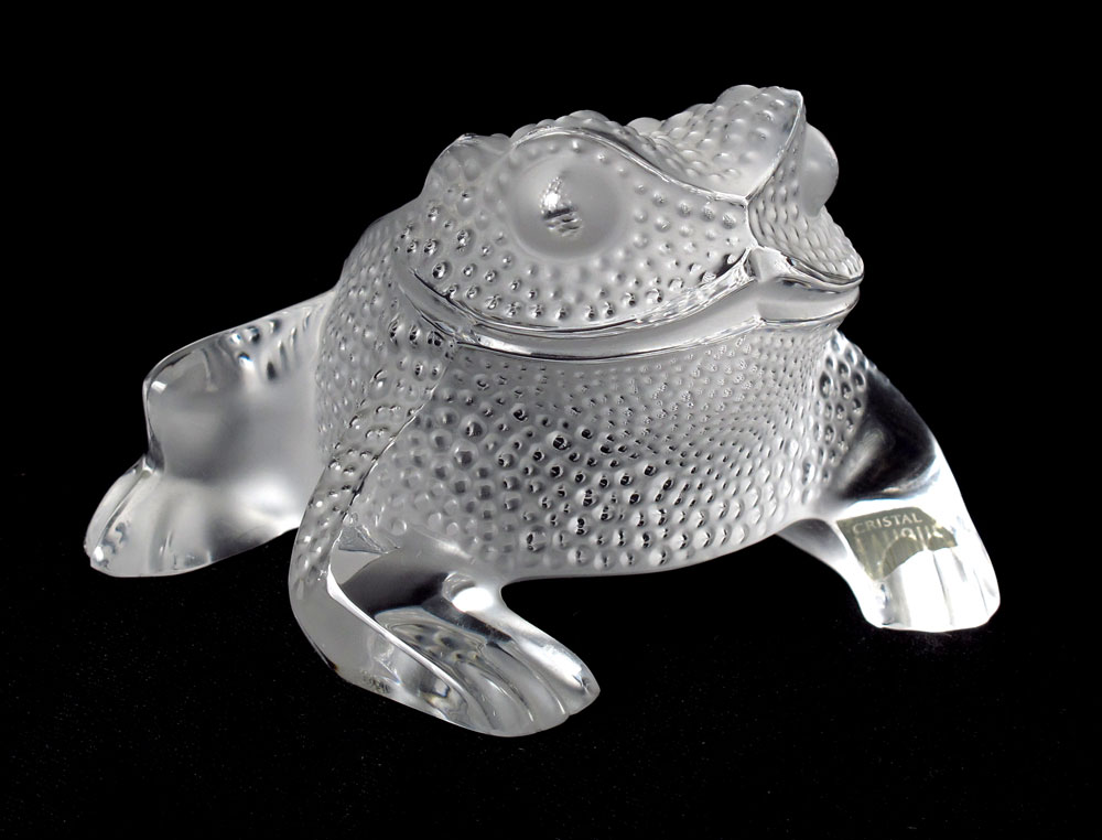 LALIQUE CRYSTAL FIGURE OF A TOAD, '' GREGOIRE'': Clear crystal figurine designed by Marie-Claude Lalique, script signature Lalique France, Made in France and remnants of crystal Lalique stickers, 3''h. x 4 1/2'' x approx. 4 1/8''.