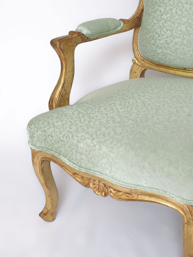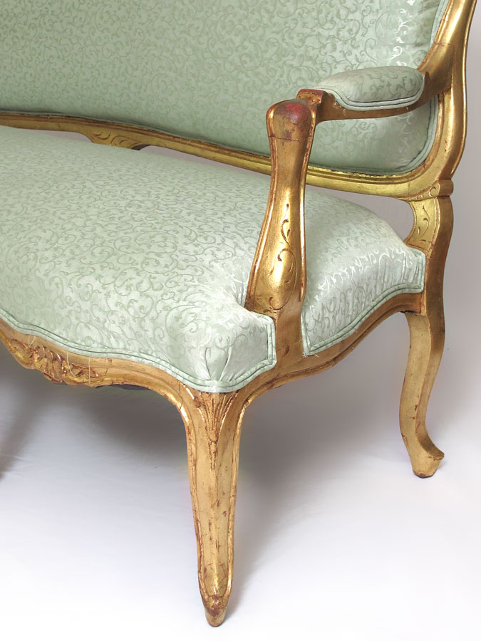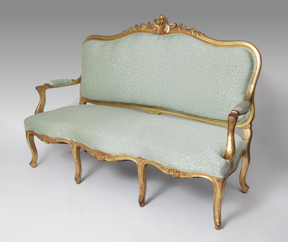 FRENCH LOUIS XV STYLE CARVED GOLD GILT COUCH: Carved top rail with shell and foliate motif. Carved and shaped arms, skirt and 6 legs. Seafoam green foliate scroll motif upholstery. 44'' h. x 65'' x 27''.