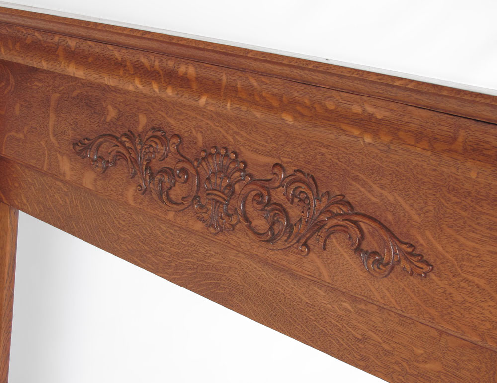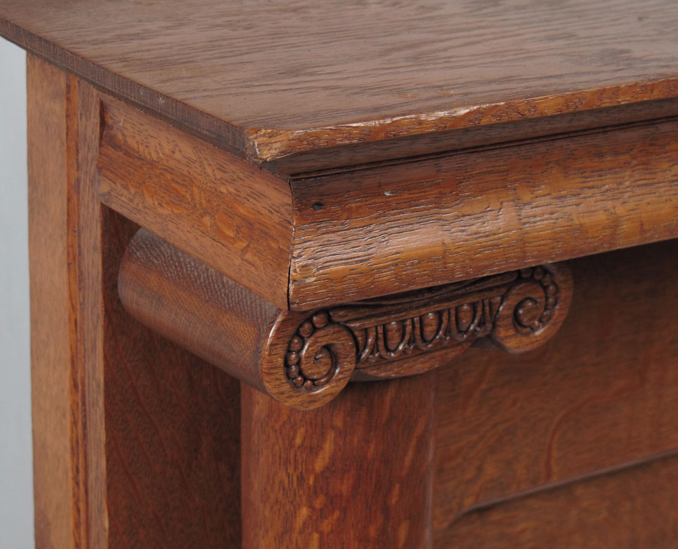 GOLDEN OAK FIREPLACE MANTLE: Applied carved decoration, carved full column supports. 48 1/4'' x 54'' x 9''.