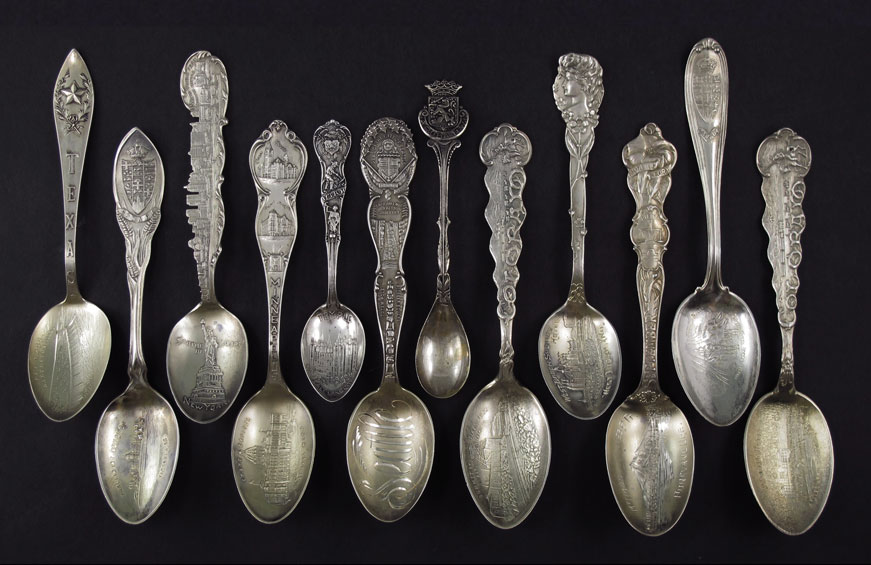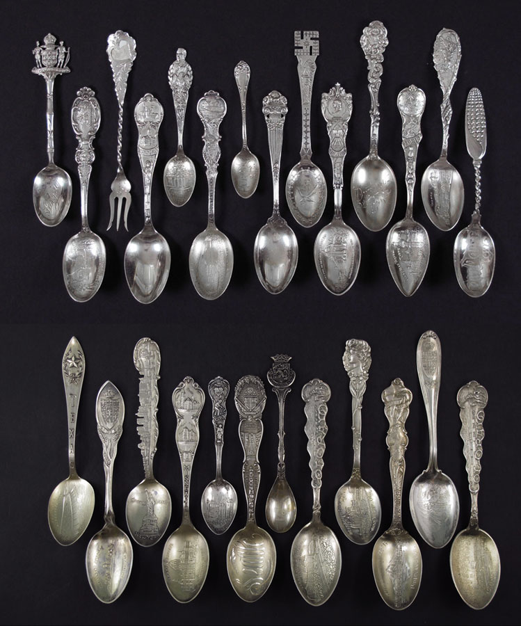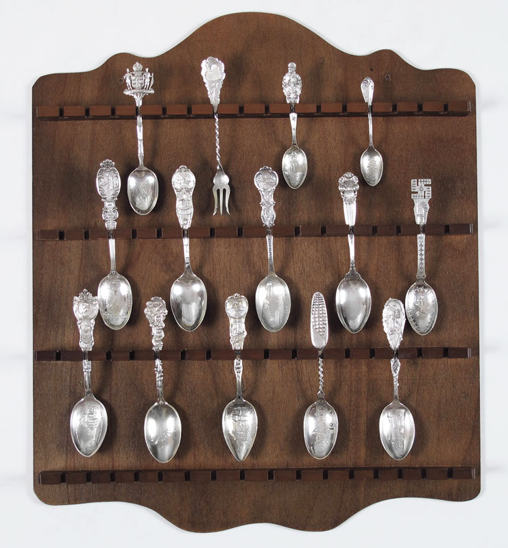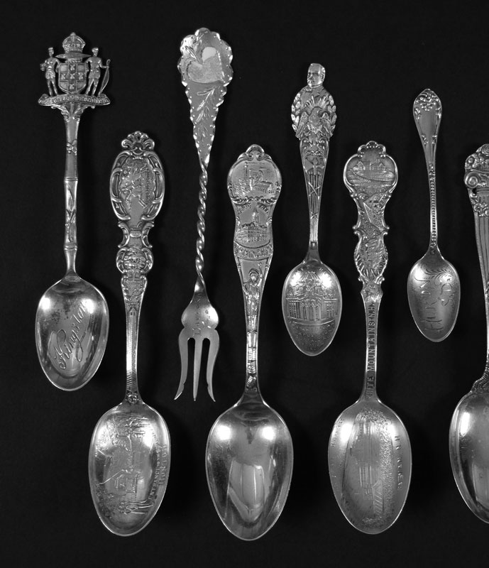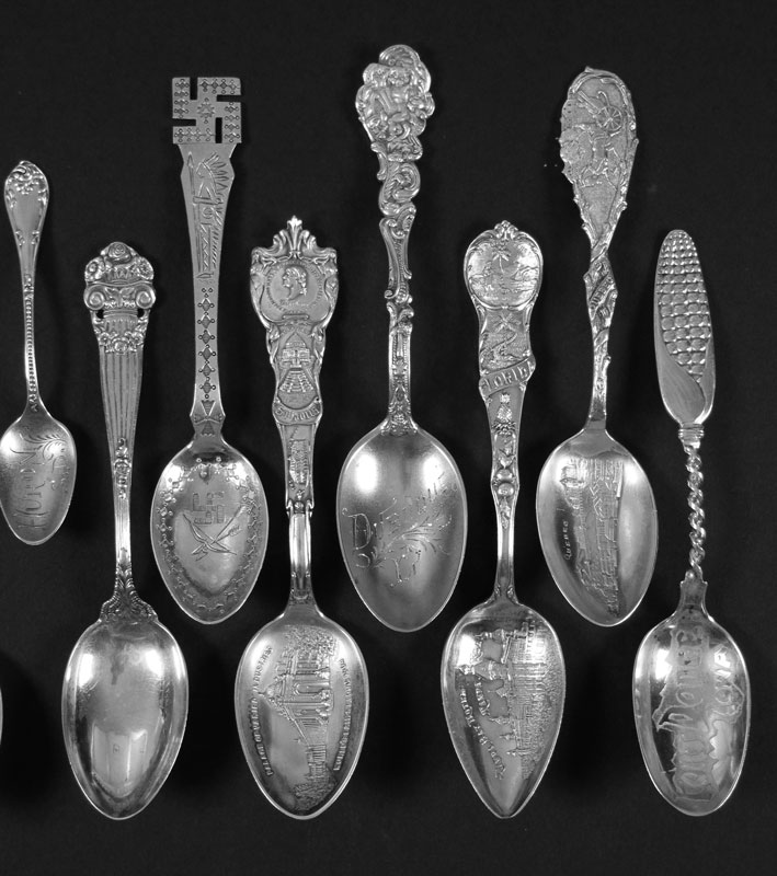 COLLECTION OF 26 STERLING SOUVENIR SPOONS: 26 spoons from various locations including White Mountains, Dubuque IA, Southwest Indians, Boston, Fort Dodge, Huron SD, Kingston, Quebec, Birmingham, Worlds Fair 1904, Pan-American Exhibition 1901, Florida and more. Sold with Daytona FL olive fork. Approx. 19.4 troy oz.