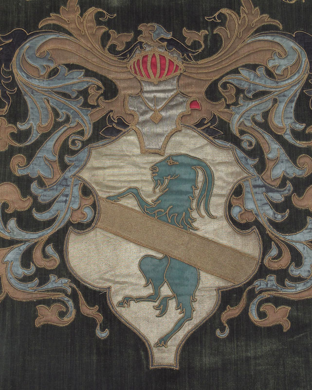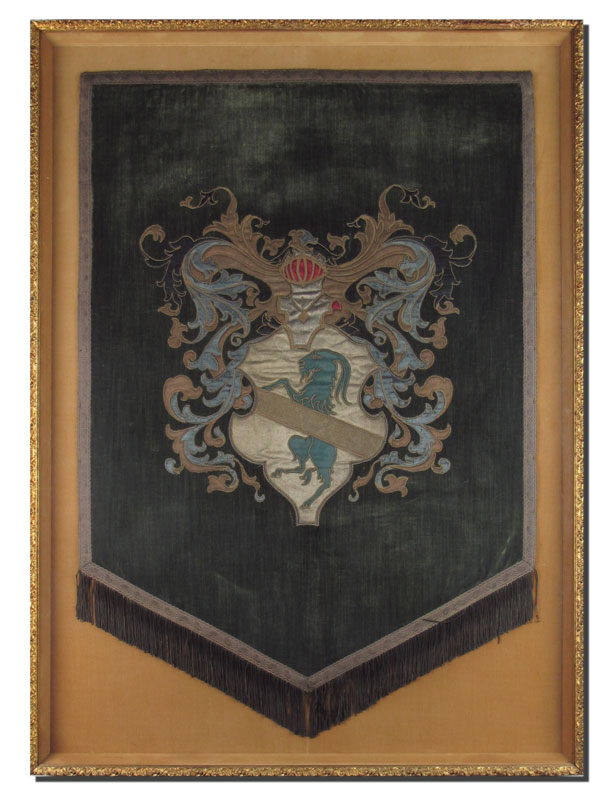 HERALDIC COAT OF ARMS IN FRAME: Azure rampant goat on ivory shield with knight head and foliate spray on fringed velvet shield. Shield measures 49'' x 33'', carved gild wood frame 54 1/2'' x 40 1/2'' x 2''.