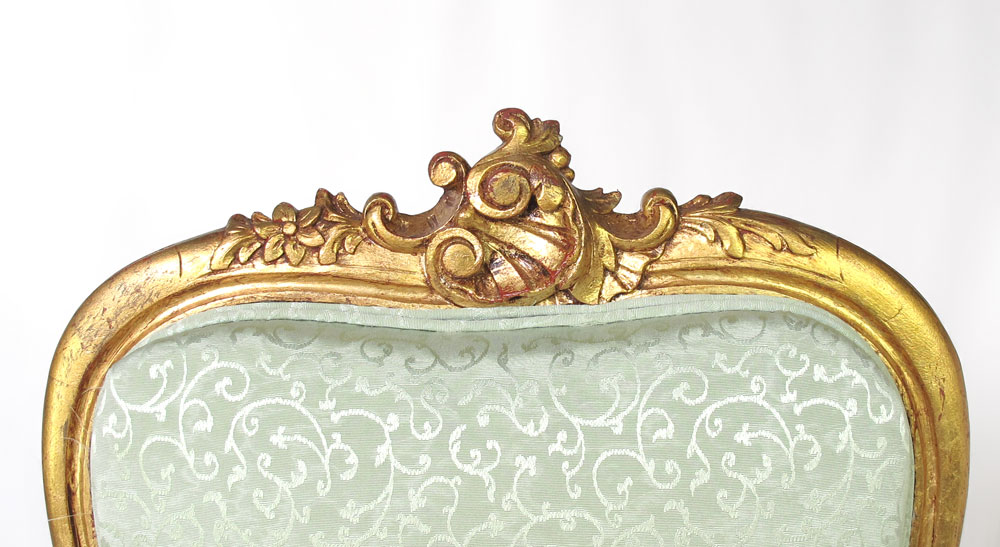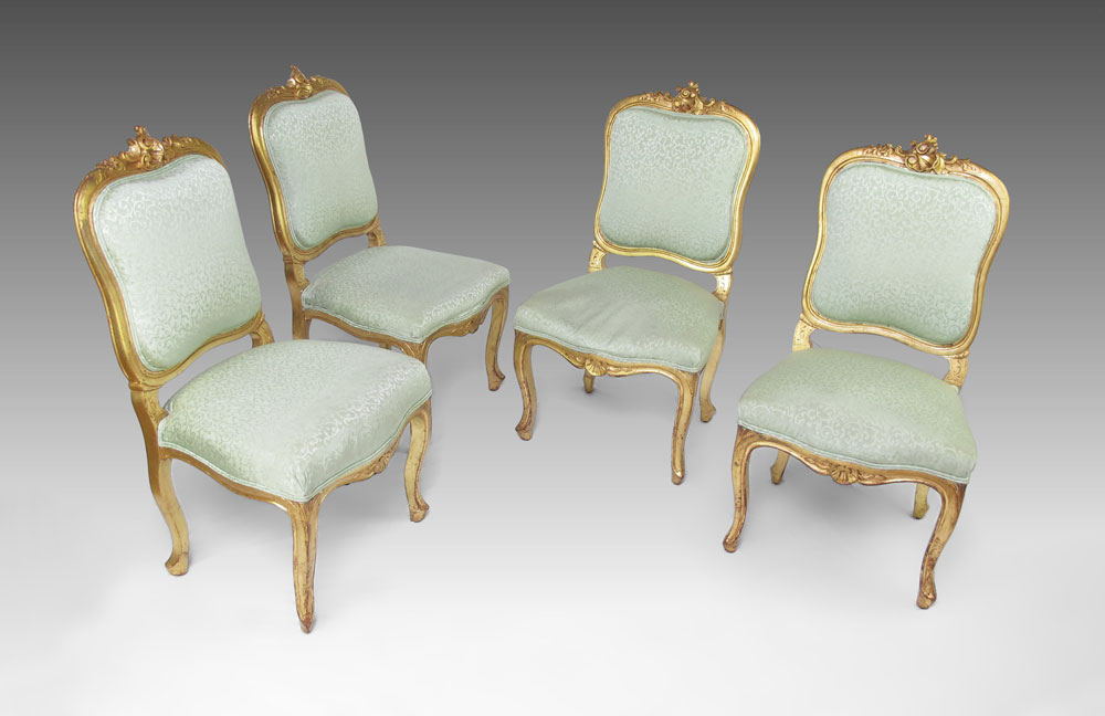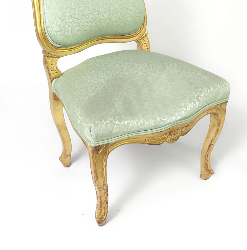 SET OF 4 LOUIS XV STYLE GILT WOOD CHAIRS: Carved top rail with shell and foliate motif. Carved and shaped arms, skirt and legs. Seafoam green foliate scroll motif upholstery. 38 3/4'' h. x 23'' x 21 1/2''.