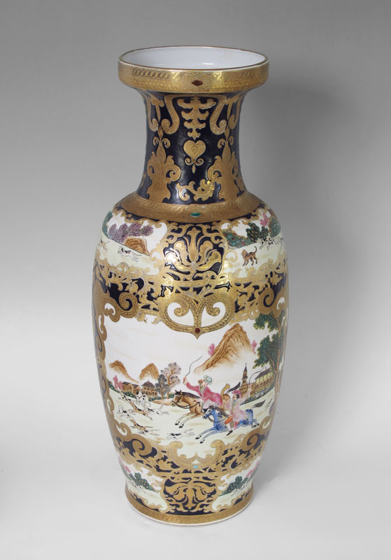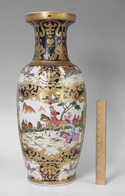 LARGE CHINESE EXPORT VASE CIRCA 1940'S: Most likely for the English market with fox hunt scenes. Signed on base in characters. 24 1/4'' h. x 10''.