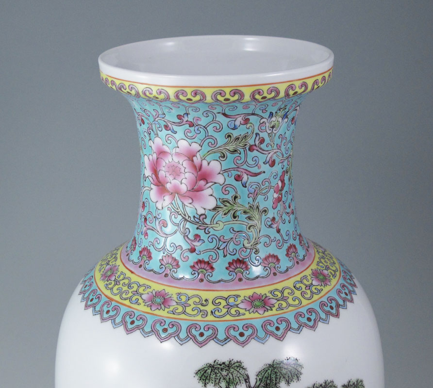 1950'S CHINESE VASE: Circa 1950's-1960's, scene of horses in field at water's edge, other incised decoration. Signed in characters on base. Measures 14 1/4'' h. x 7''. Sold with carved wood base 1 1/2'' h. x 6 1/2'' square.