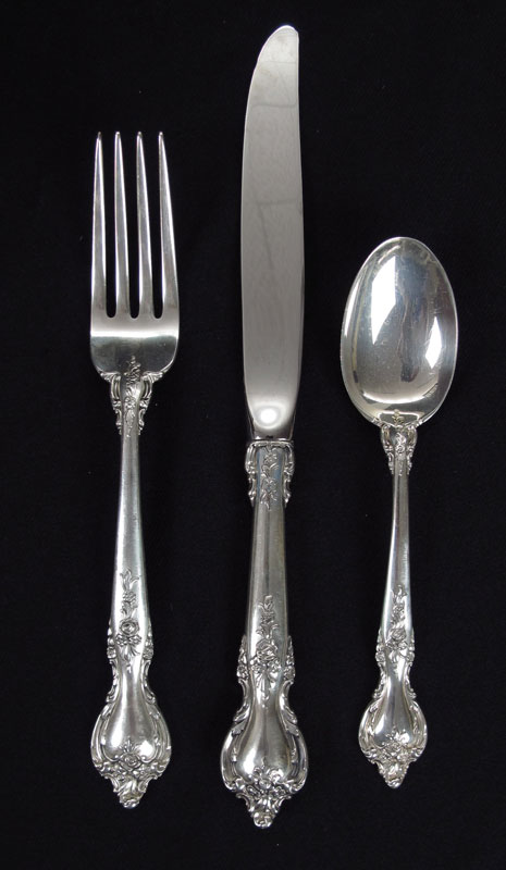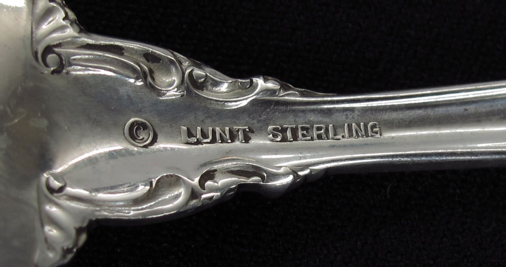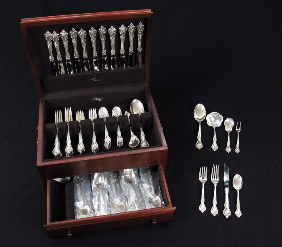 LUNT DELACOURT STERLING FLATWARE SERVICE: Approx. 70 pieces in the Delacourt pattern by Lunt to include 11 forks (7 1/2''), 11 salad forks (6 3/4''), 24 teaspoons (9 unused in original bags, 6''), 6 soup spoons unused in original bags (6 3/4''), 12 hollow knives (9 1/8''), 3 serving spoons (8 1/2''), cream ladle (6 1/2''), 2 sugar scoops (6 1/4''), cocktail fork (5 7/8''). Sold with silver chest, 7 1/4'' h. x 16'' x 12 1/4''. Approx. 100.6 troy oz.