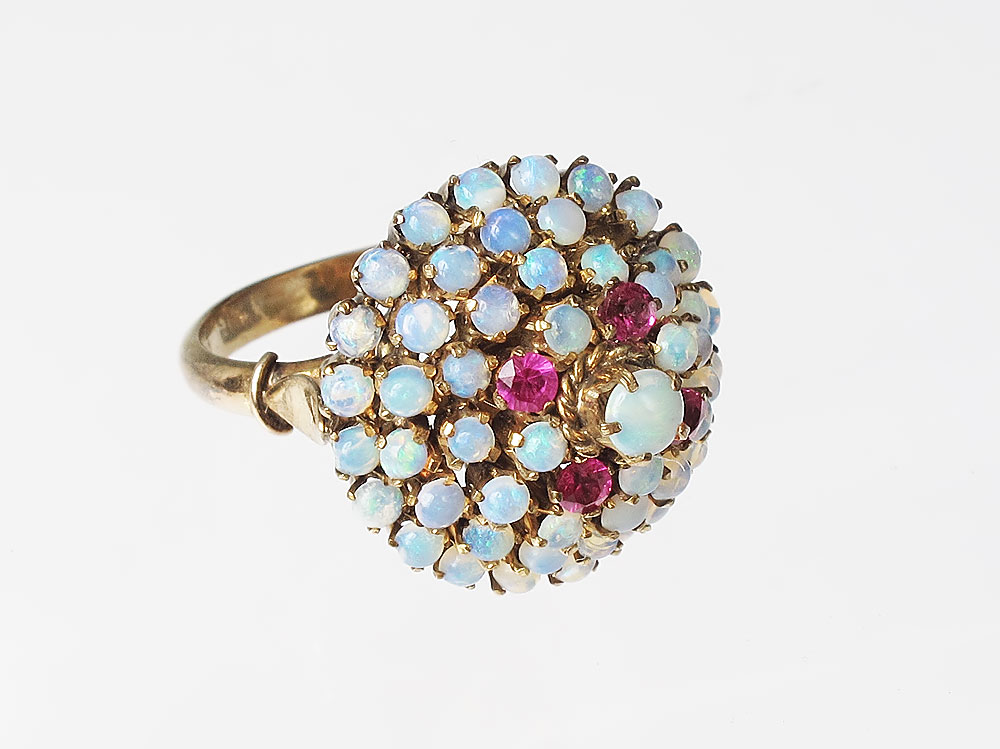 OPAL PRINCESS RING: 14K yellow gold ring contains 52 round cabochon cut opals with a blue-green play-of-color. One opal is missing. The 4 round mixed cut rubies are synthetic and total approx. .65 Ct. The opals and rubies are prong set. Weight: 6.6 grams. Size: 7