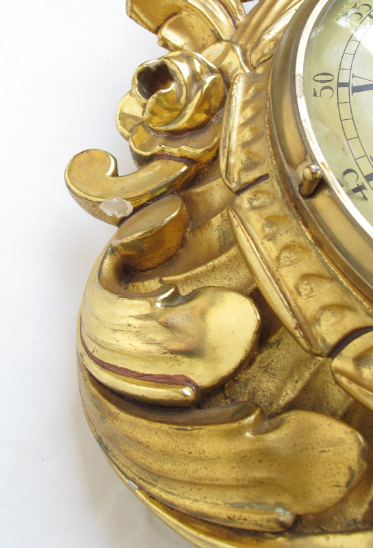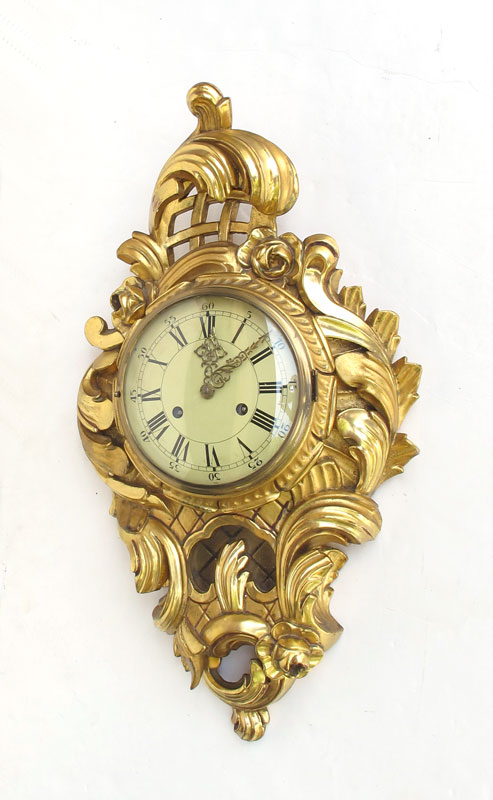 SWEDISH GILT CARVED WOOD CARTEL CLOCK: Mid-20th century production, carved and gilt wood case. Painted metal face with Arabic and Roman numerals. Missing key. 22 3/4'' h. x 14'' x 4 1/2''.