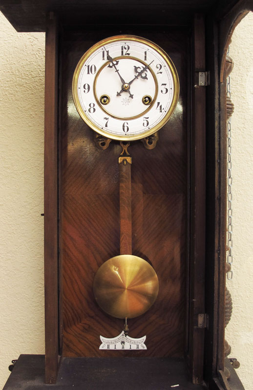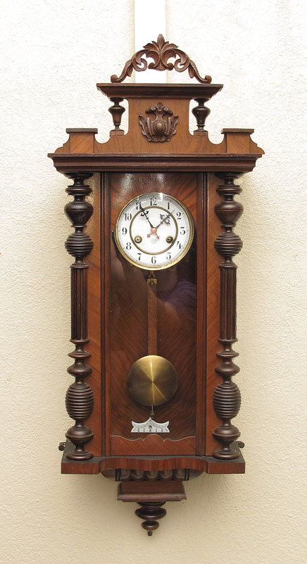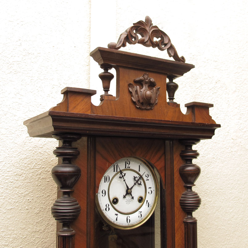 JUNGHANS GERMAN REGULATOR CLOCK: Carved crest with applied decoration, carved half columns on body. Junghans key wind time and strike movement. Enamel face with Arabic numerals. Measures 38'' h. x 14 3/4'' x 7''.
