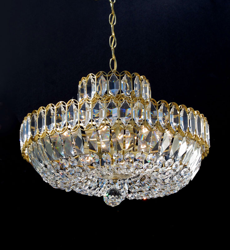 RETRO CRYSTAL CHANDELIER: Gold tone frame, bowl type chandelier, unusual rectangular crystals, 8 lights. Measures approx. 12''h. x 19'' dia. excluding chain.