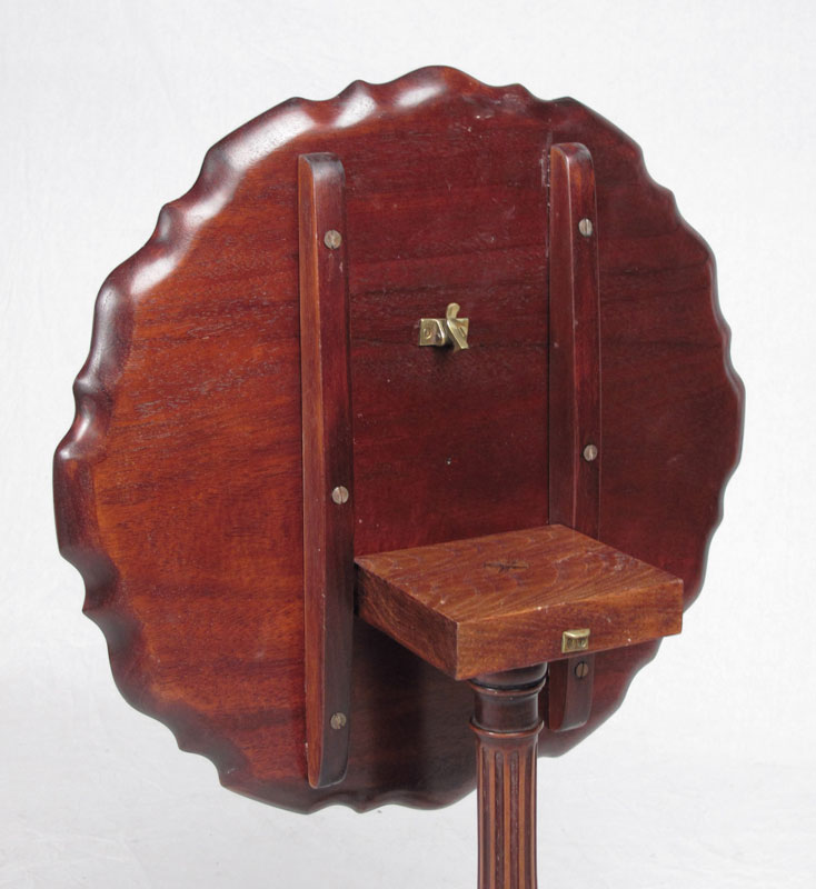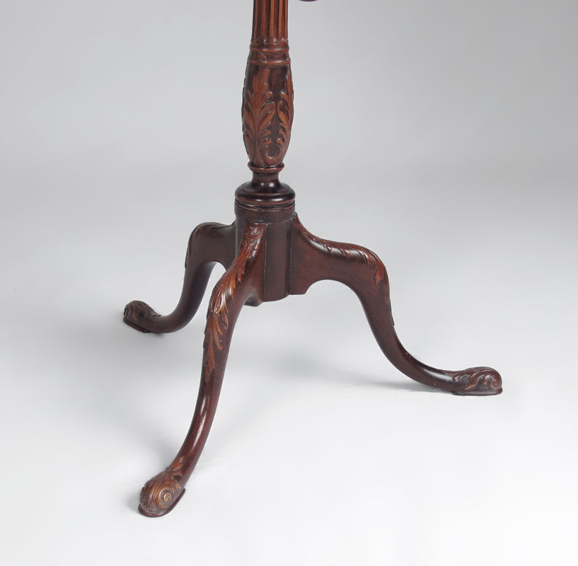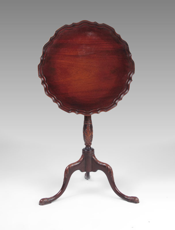 CARVED PIECRUST TILT TOP CANDLE STAND: Mahogany with shaped piecrust top, carved body, carved splayed leg base. 24 3/4'' h. x 19 1/2'' base dia.