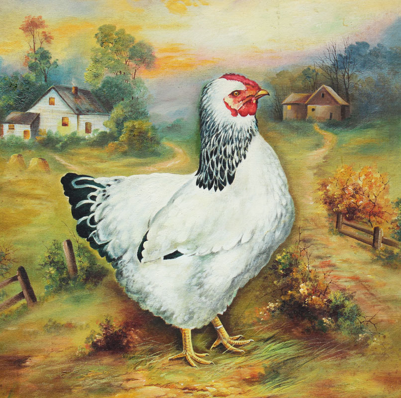 STUART, Ralph (American, 20th C.): Mother Hen in a Country Landscape, Oil/Canvasboard, 24'' x 18'', signed lower right, dated '36, gilded frame, 26 1/2'' x 20 1/2''. Painted by one of Buffalo Pottery's preeminent artists Ralph Stuart.