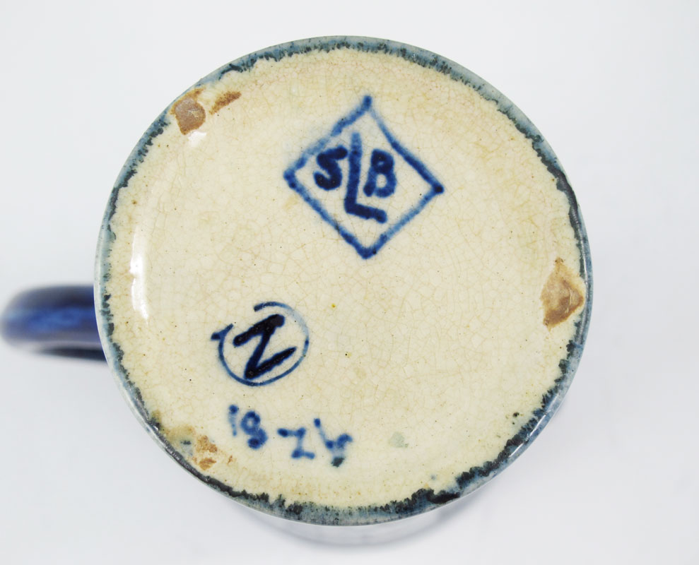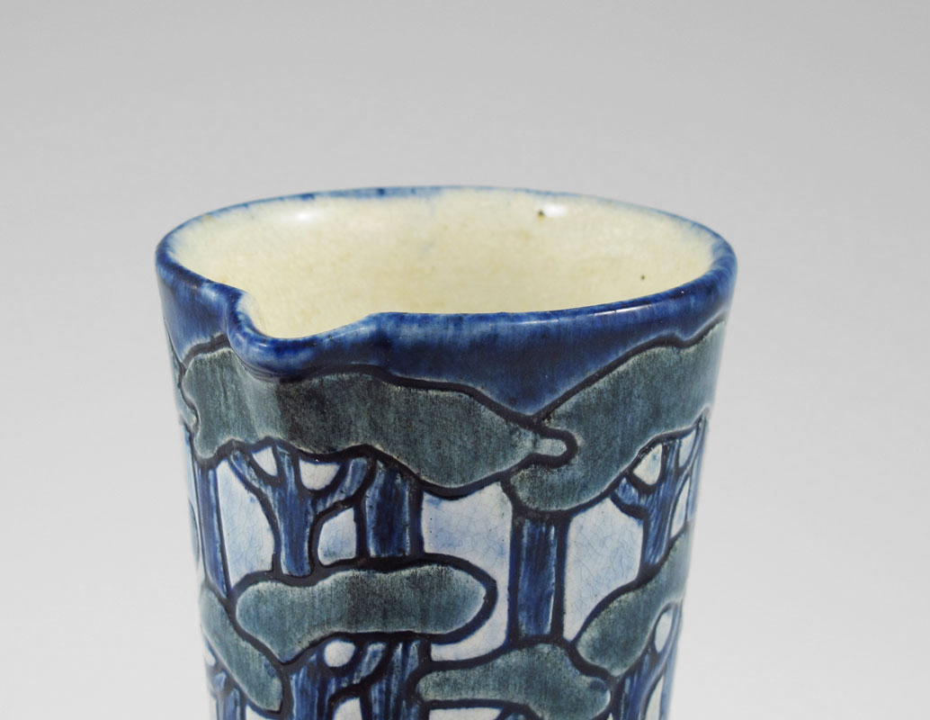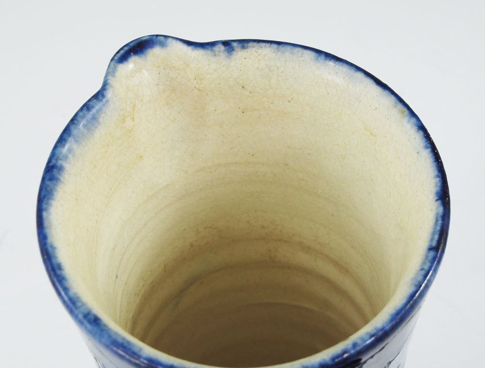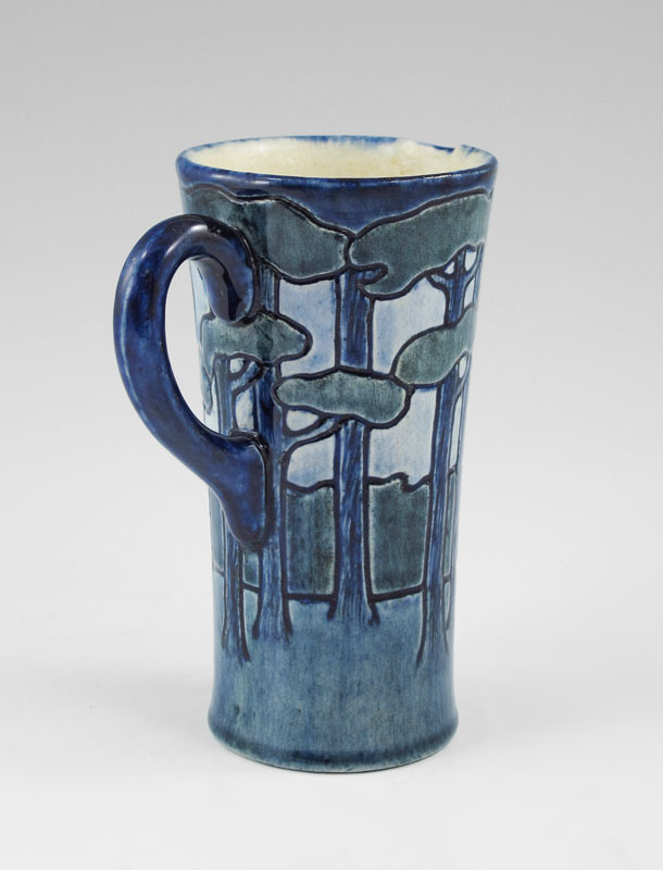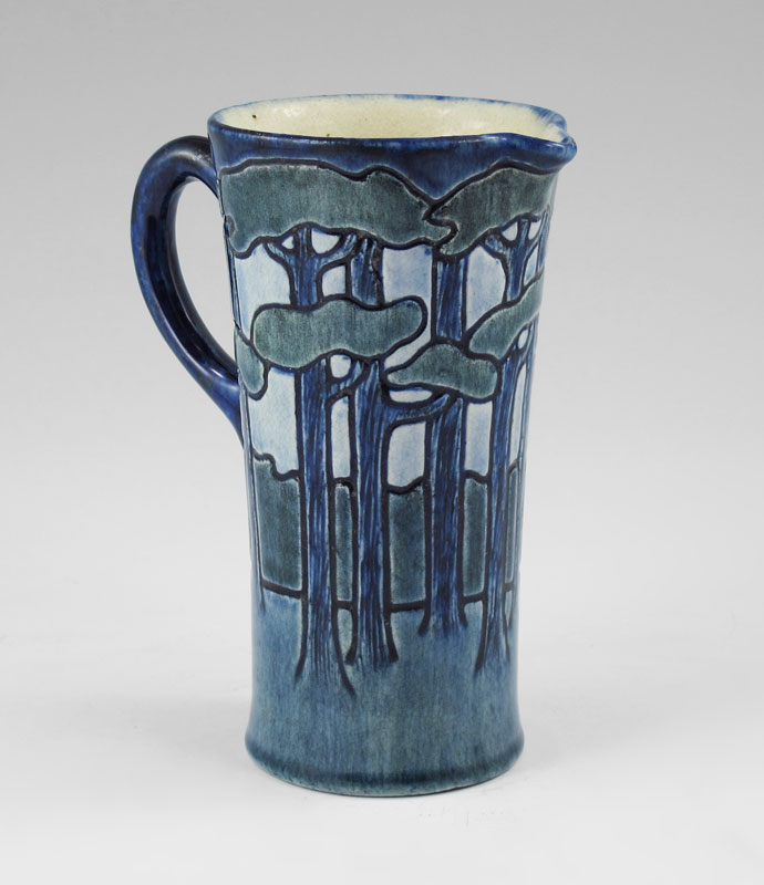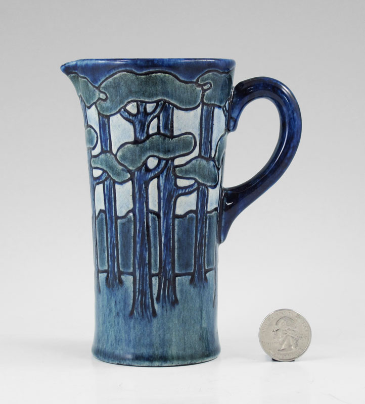 NEWCOMB COLLEGE POTTERY PITCHER: Ca. 1906. Decorated by Sara Bloom Levy with a stylized pine forest. Blue under glaze NC insignia, artist SLB mark, and AZ81. Approx. 5'' tall.