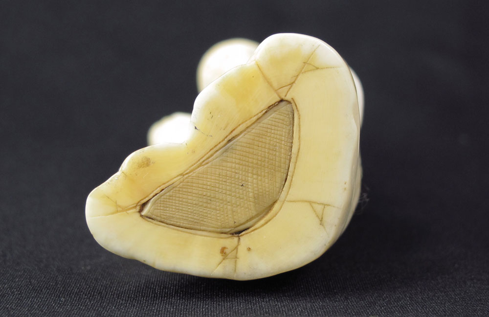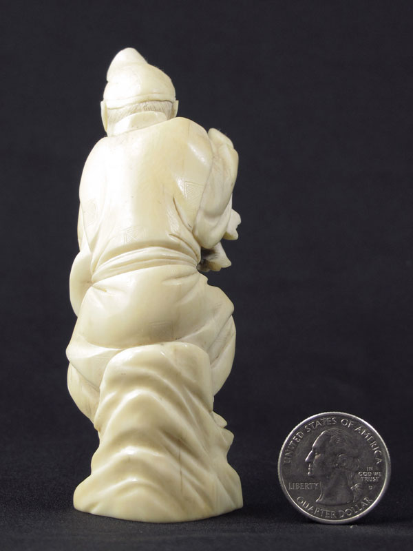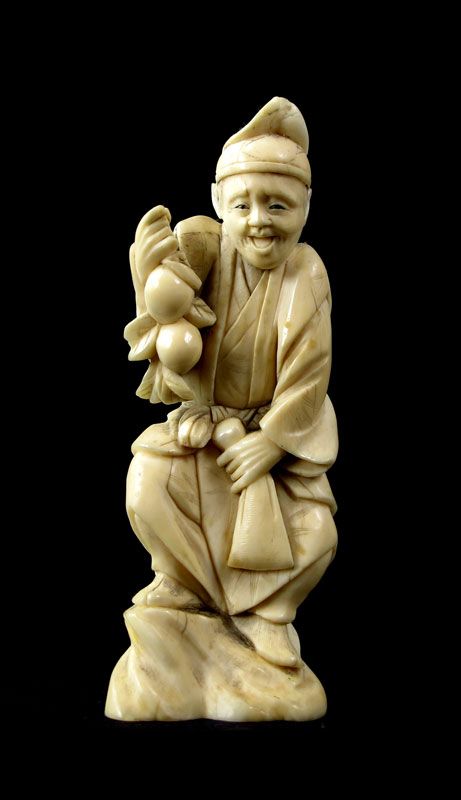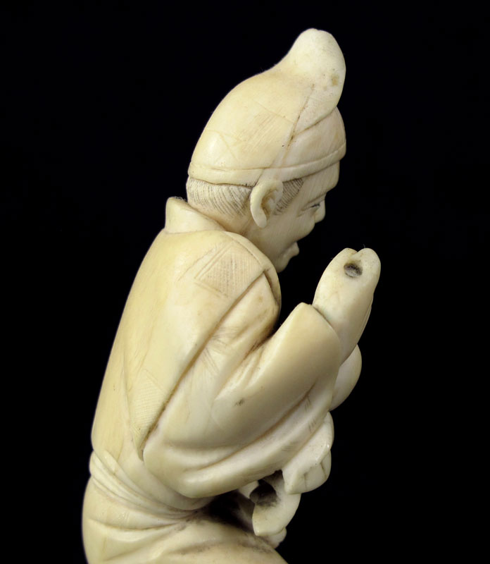 CARVED IVORY FRUIT SELLER: Figure of man holding branch of fruit and money bag. Unsigned. Measures 4 1/4'' h.