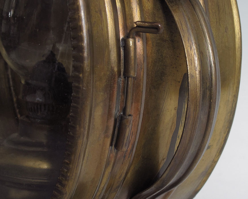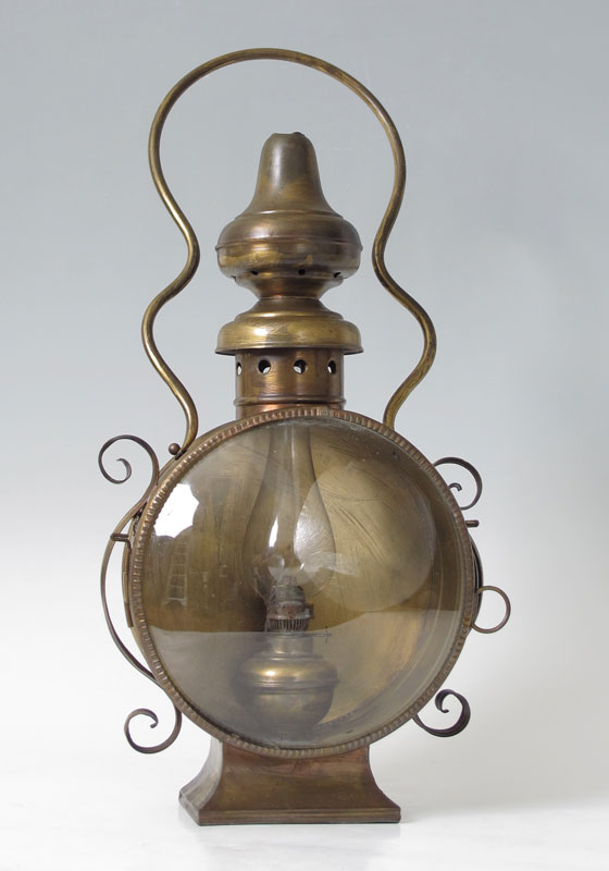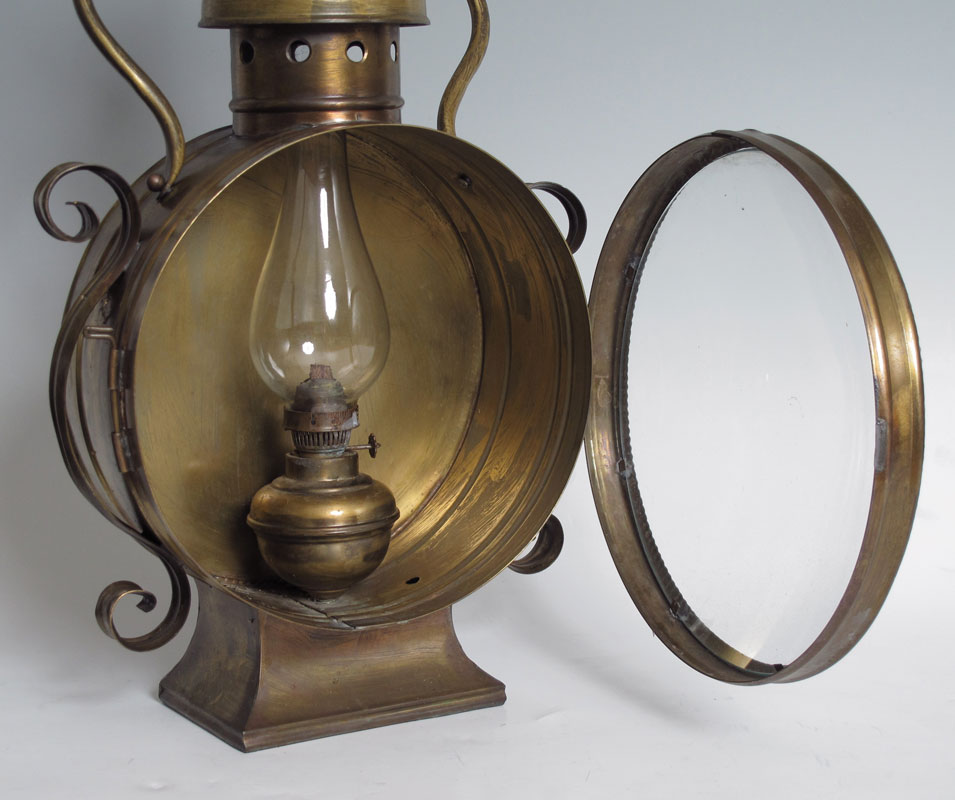 A UNIQUE BRASS SHIP'S OIL LANTERN: A most unusual form hanging brass ship's lantern. Unmarked, oil font screws into base behind original convex glass front. Applied scroll decoration on sides. Overall 25 3/4'' h. x 12 1/4'' x 6''.