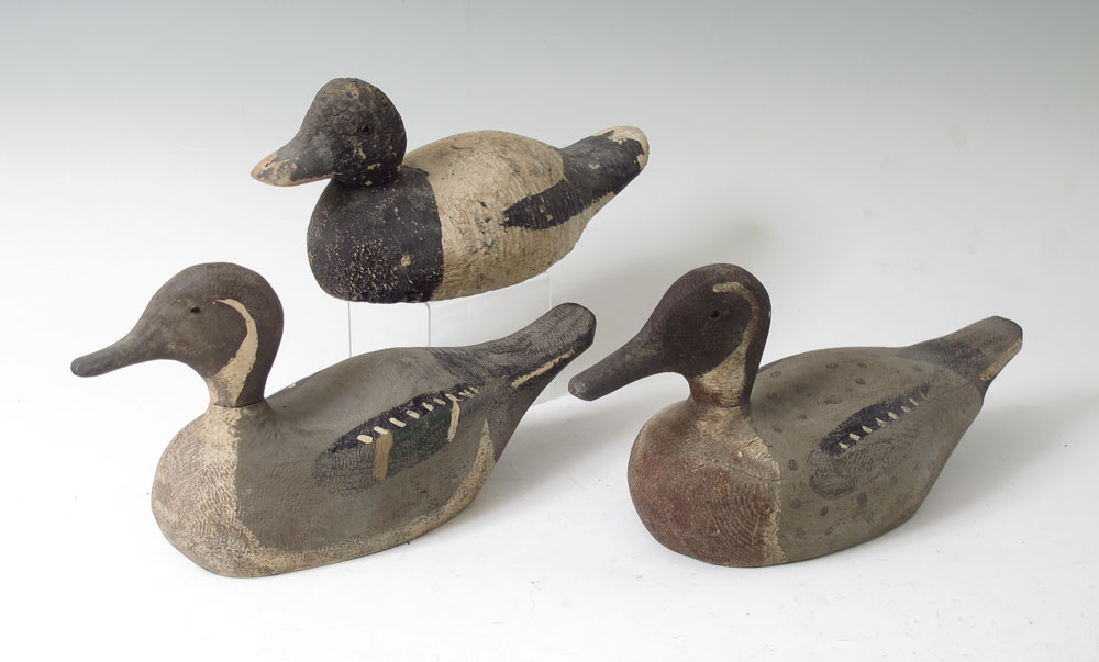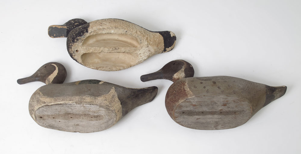 COLLECTION OF 3 WORKING DUCK DECOYS: All unidentified as to maker, to include 1) Pintail drake with glass eyes, 7 1/2'' h. x 14 3/8'' x 5''. 2) Pintail drake with glass eyes, repair on side by neck, 7 1/2'' h. x 15'' x 5 1/4''. 3) Scaup hollow body drake with glass eyes, 6'' h. x 13 1/2'' x 5 1/2''.