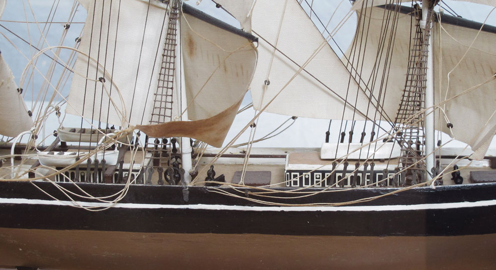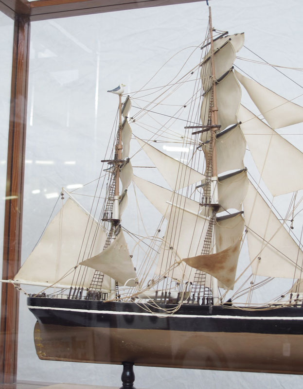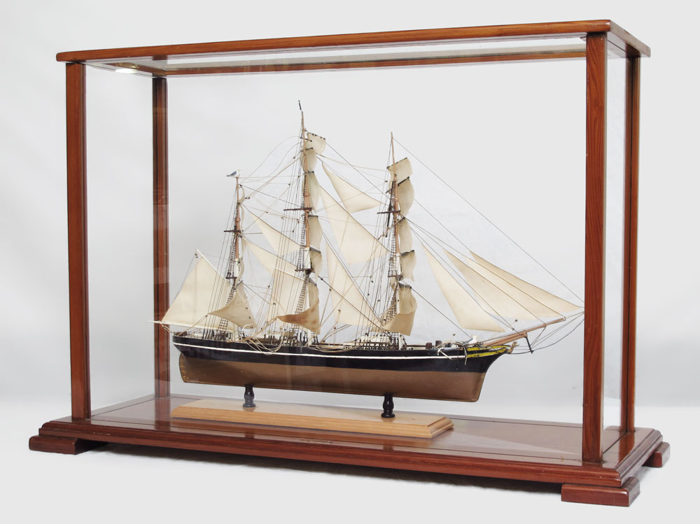 CLIPPER SHIP MODEL IN CASE: Hand crafted clipper ship model on stand with wood and glass case. Ship measures 15'' x 24 1/2''. Case measures 21'' x 31 1/2'' x 12''.