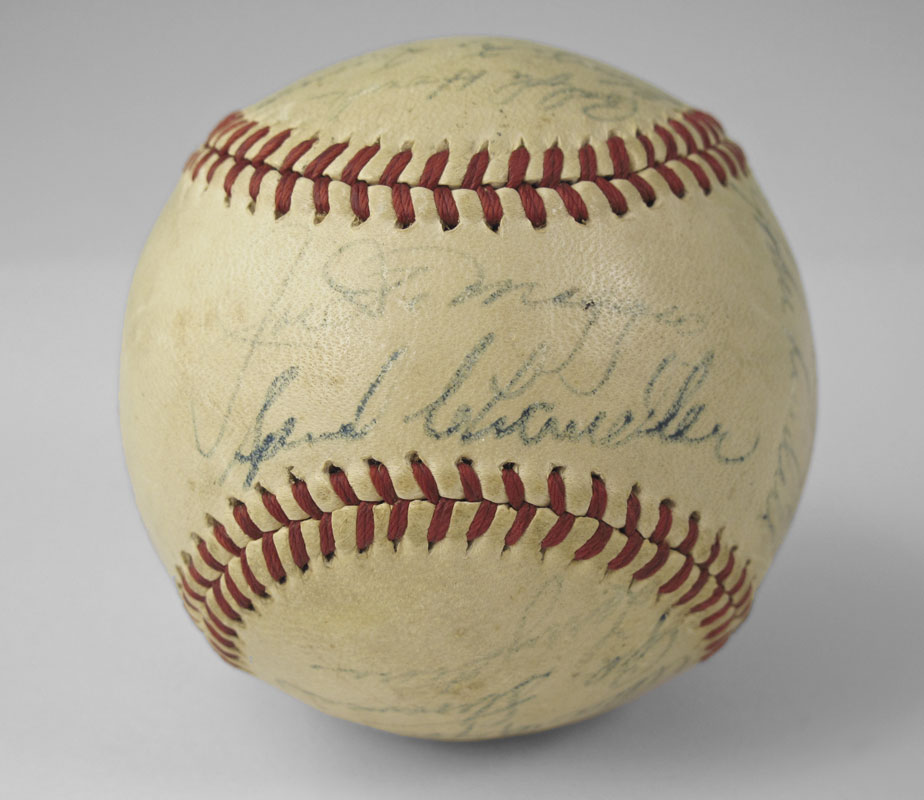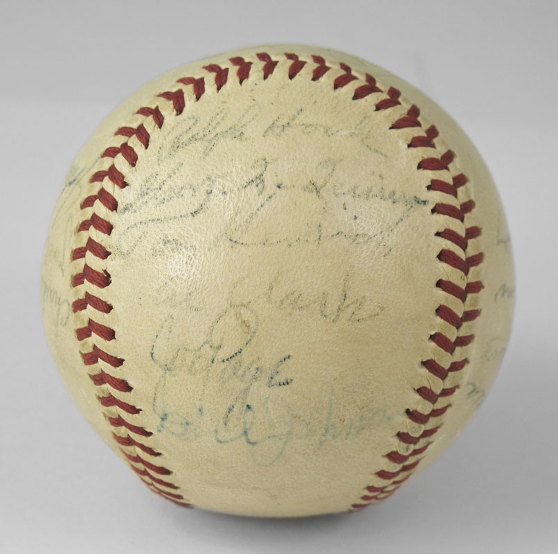 1947 TEAM SIGNED NEW YORK YANKEES BASEBALL: Autographs to include Joe Dimaggio and Spud Chandler in sweet spot, other signatures Ralph Houk, Tom Heinrich, Allie Clark, Joe Page, Bill Johnson, Speck (signed Frank) Shea, Karl Drews, Bill Bevens, Vic Raschi, Randy Gumpert, Bobby Brown, Allie Reynolds, John Lindell and several unidentified.