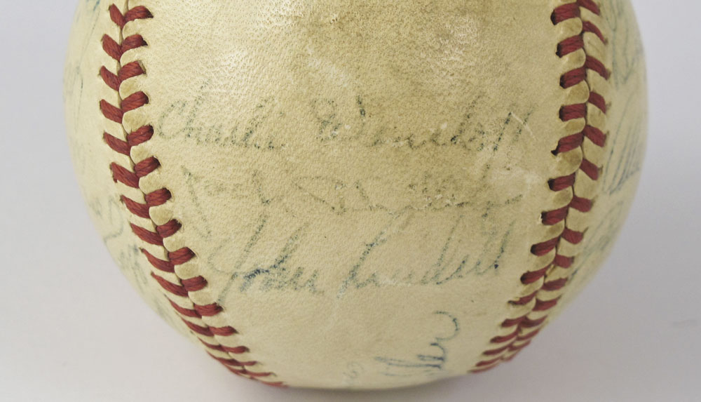 CONDITION: Signatures show varying degrees of clarity, yellowing to ball with some signs of play and use.