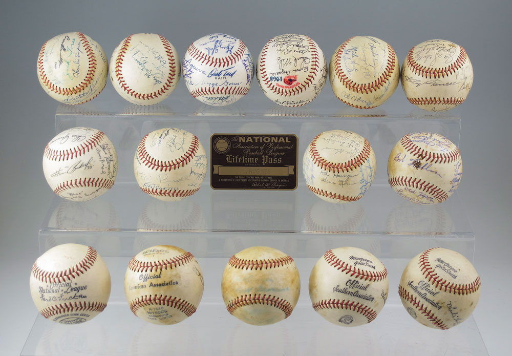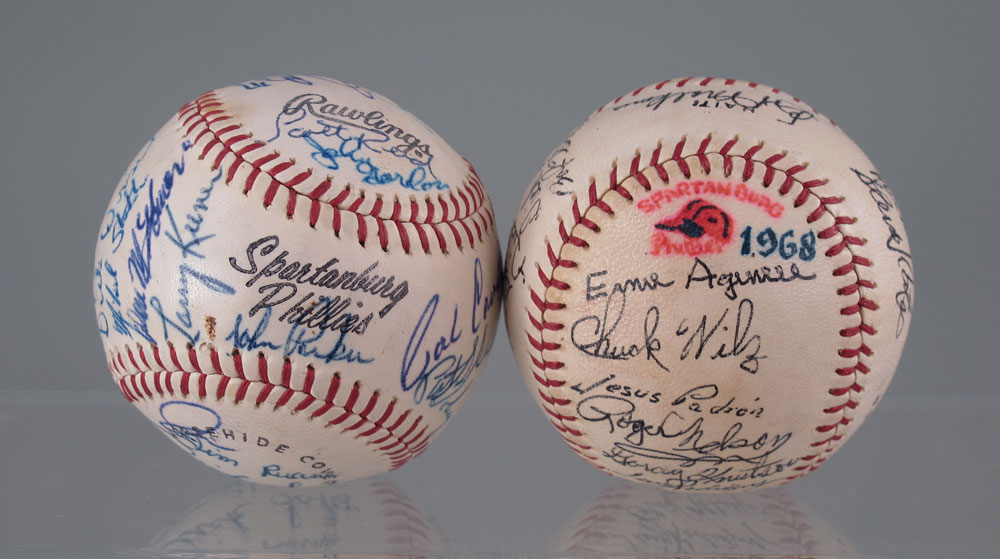 15 ASSORTED SPARTANBURG PEACHES SIGNED BASEBALLS: A collection of baseballs from the farm team Spartanburg Peaches (a Cleveland Indian affiliate) and the Spartanburg Phillies (Philadelphia Phillies affiliate). Circa late 1940's to one dated 1968. 11 balls are signed by various team members, 4 are unsigned. Sold with a National Association Baseball Leagues Lifetime Pass presented to G. L. Hughes, the owner of the Peaches and Phillies.