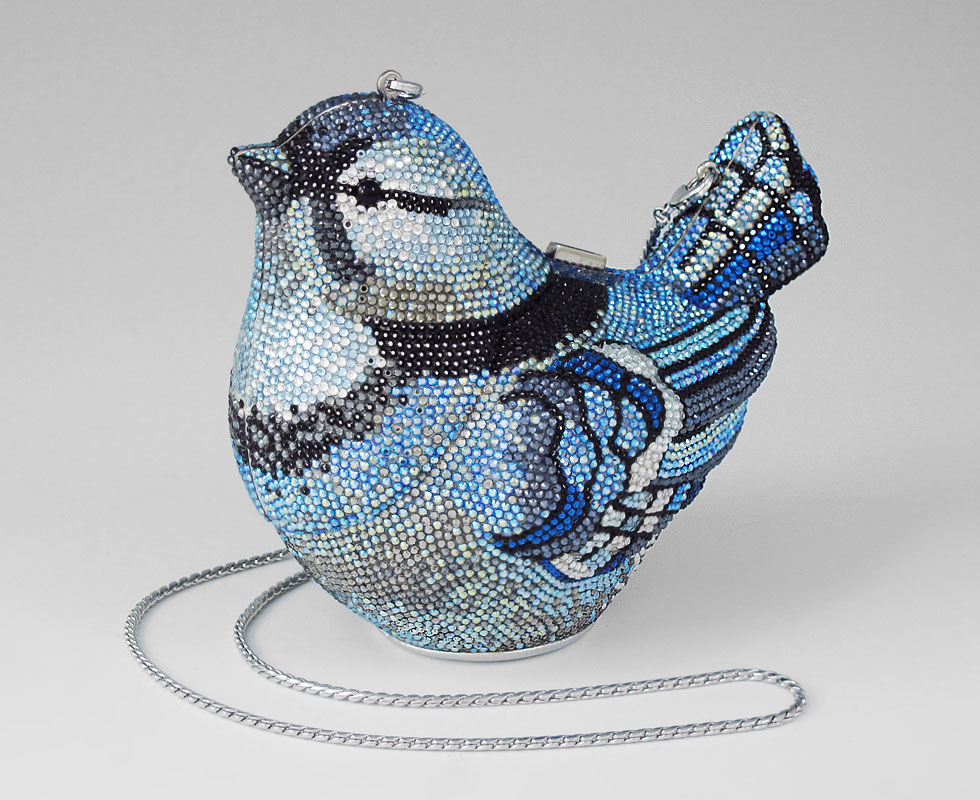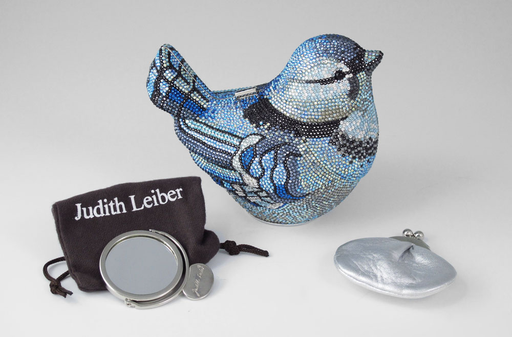 JUDITH LEIBER CRYSTAL BLUEBIRD MINAUDIERE PURSE: Covered in Austrian crystal. Includes the mirror in bag and coin purse. Silvered interior. Hidden 40'' chain. Approx. 4 1/2'' x 5''. Unused condition.