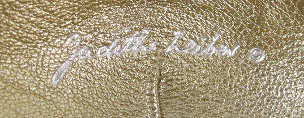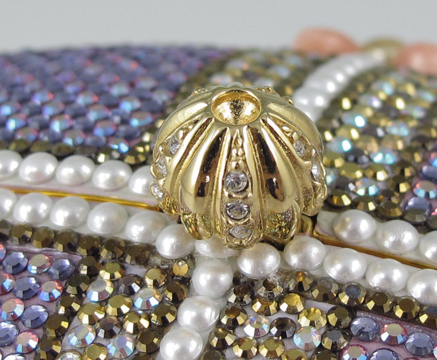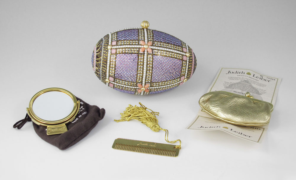 JUDITH LEIBER CRYSTAL EGG MINAUDIERE PURSE: Covered in Austrian crystal and what appears to be coral and seed pearl. Includes the mirror in bag, coin purse, comb, and registration certificate. Hidden 40'' chain. Approx. 5 1/2''. Unused, interior in excellent condition, missing a few crystals, pearls and small spots of enamel.