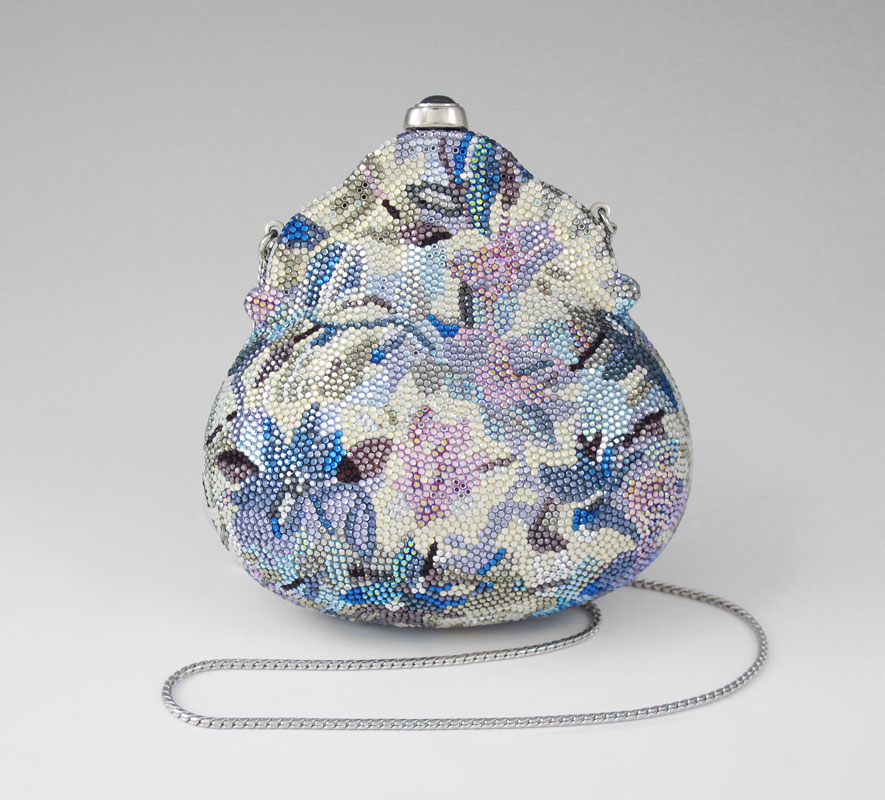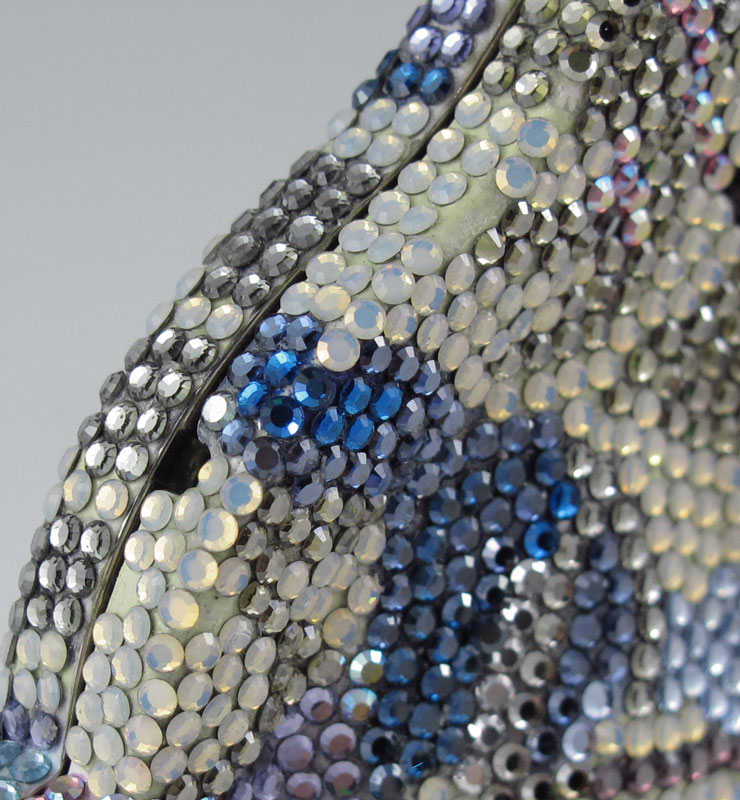 JUDITH LEIBER CRYSTAL MINAUDIERE PURSE: Covered in Austrian crystal. Includes the mirror in bag, coin purse, and registration number. Hidden 40'' chain. Approx. 5'' x 4 1/2''. Unused, interior in excellent condition, missing the occasional crystal.