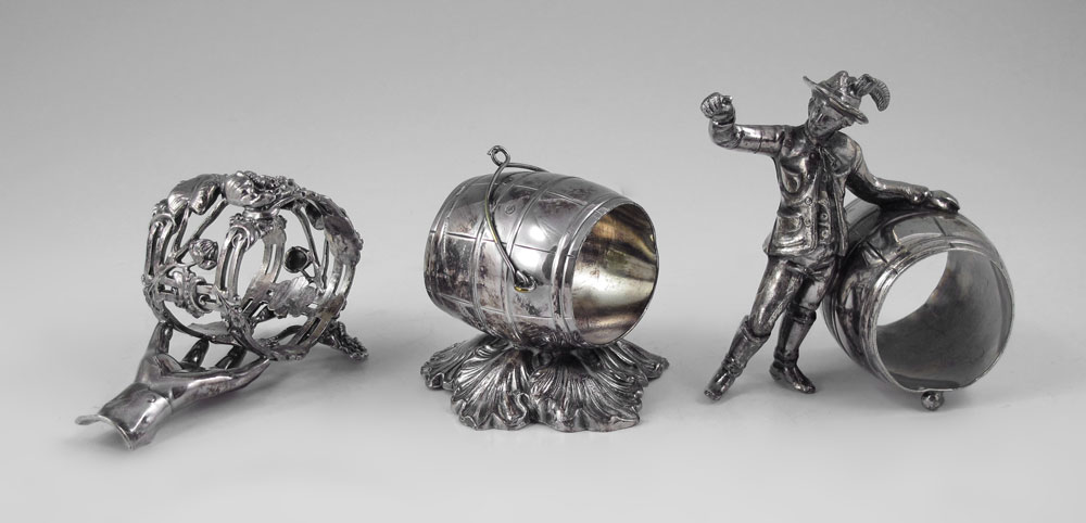 3 PIECE SILVERPLATE FIGURAL NAPKIN RINGS: To include 1) Figural European man with keg barrel, unmarked. 3 5/8'' h. x 3 3/4''. 2) Figural hand holding floral ring, unmarked. 2 1/2'' x. 3 3/4''. 3) Wilcox barrel on leaf. 2 5/8'' x 2 7/8''.