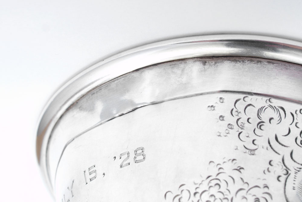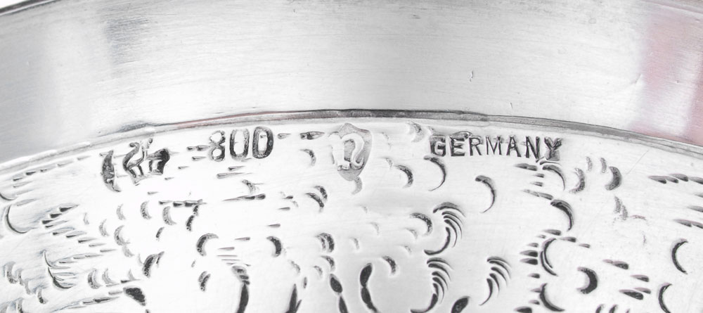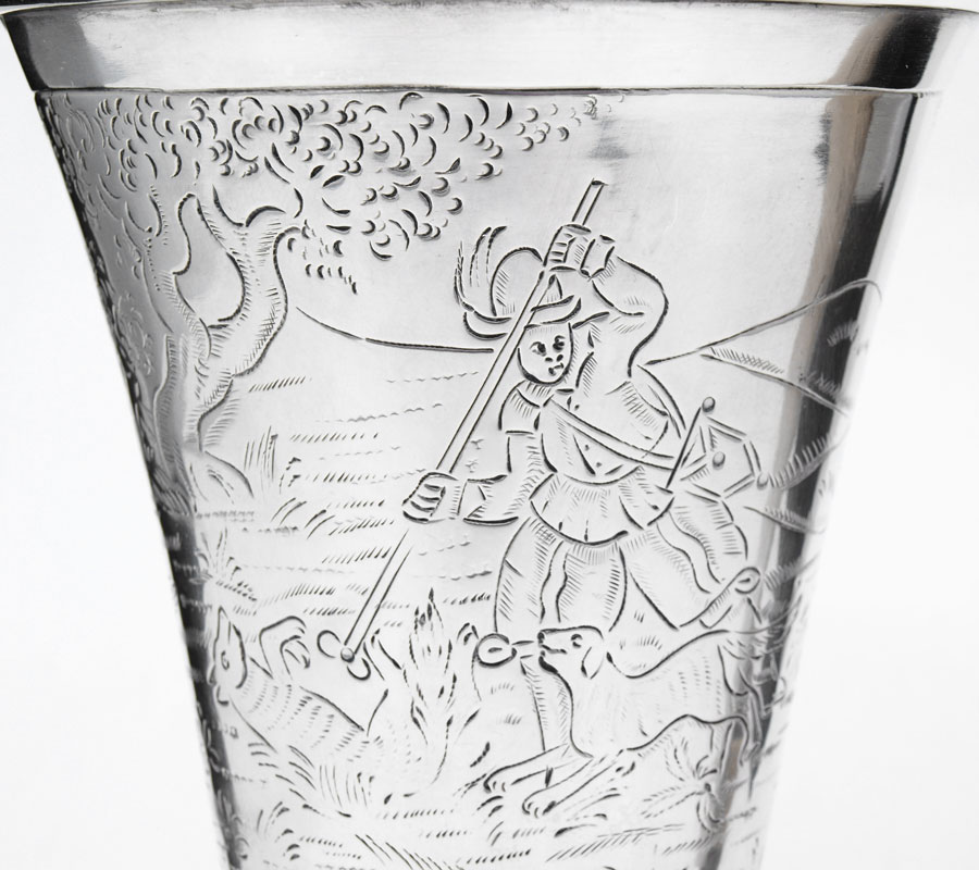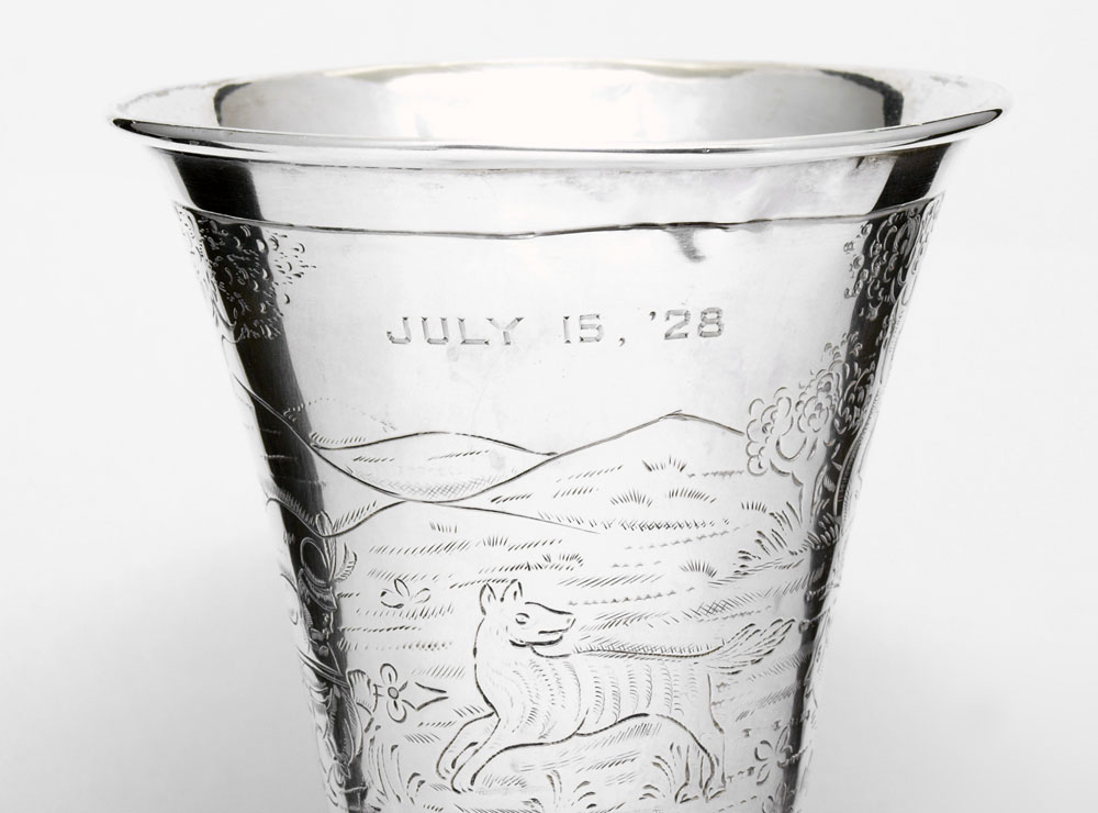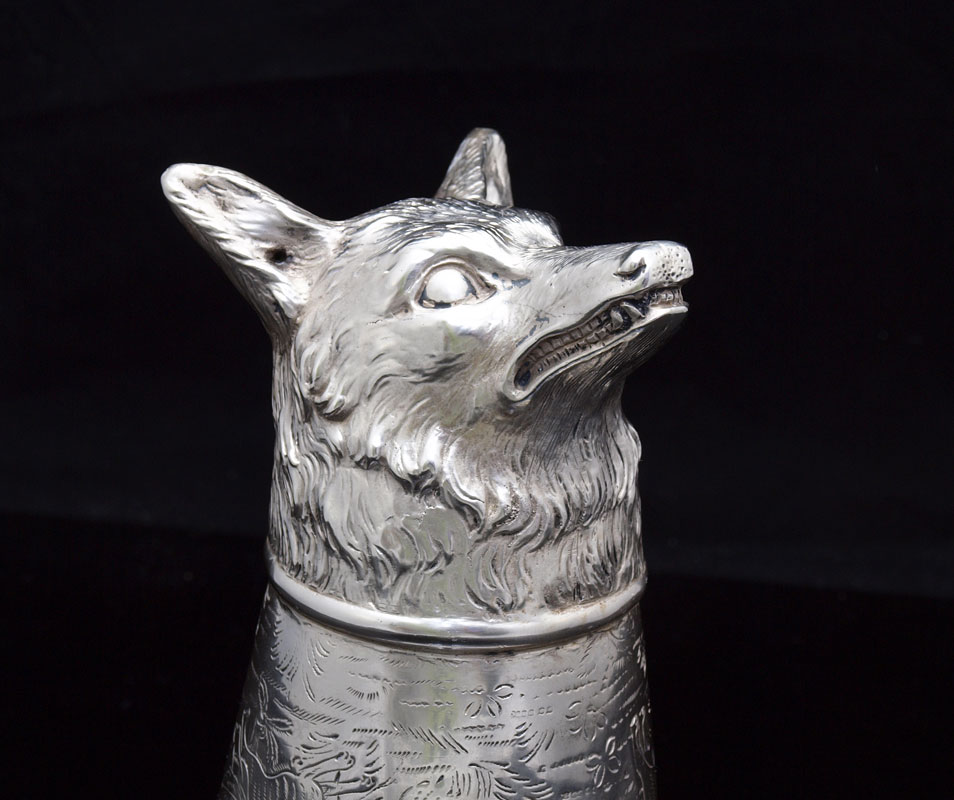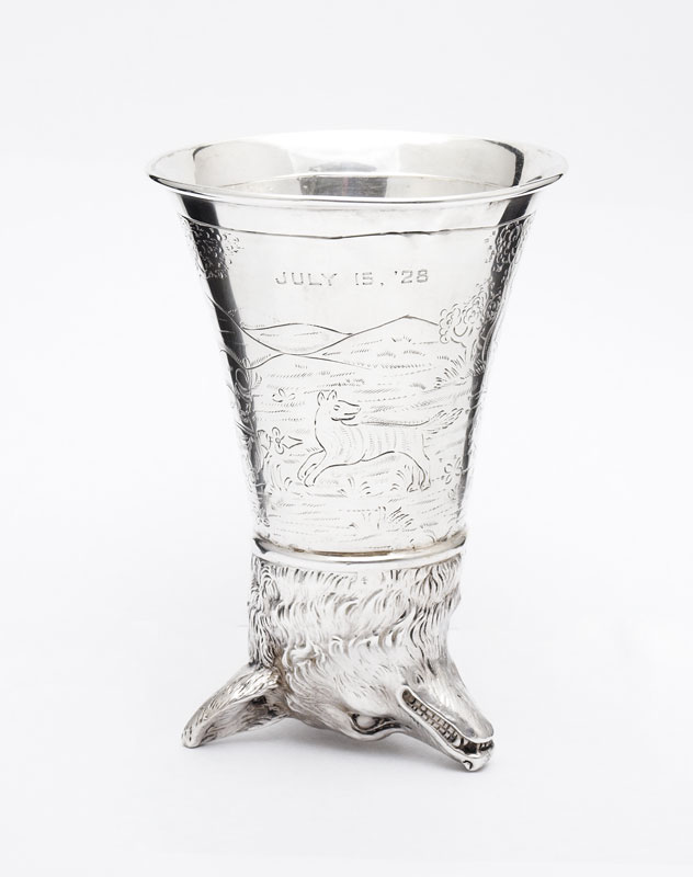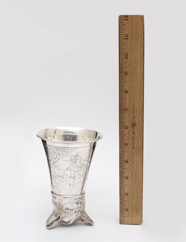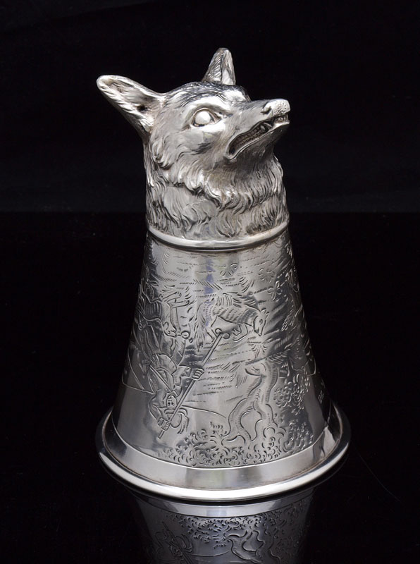 NERESHEIMER SILVER STIRRUP CUP WITH FOX HEAD: Fox head base with engraved fox hunt scene on body. Inscribed July 15, '28. Hallmarked with Hanau silversmith Ludwig Neresheimer hallmark, German 800 silver. 5 1/2'' h. x 3 3/4''. Approx. 6.6 troy oz.