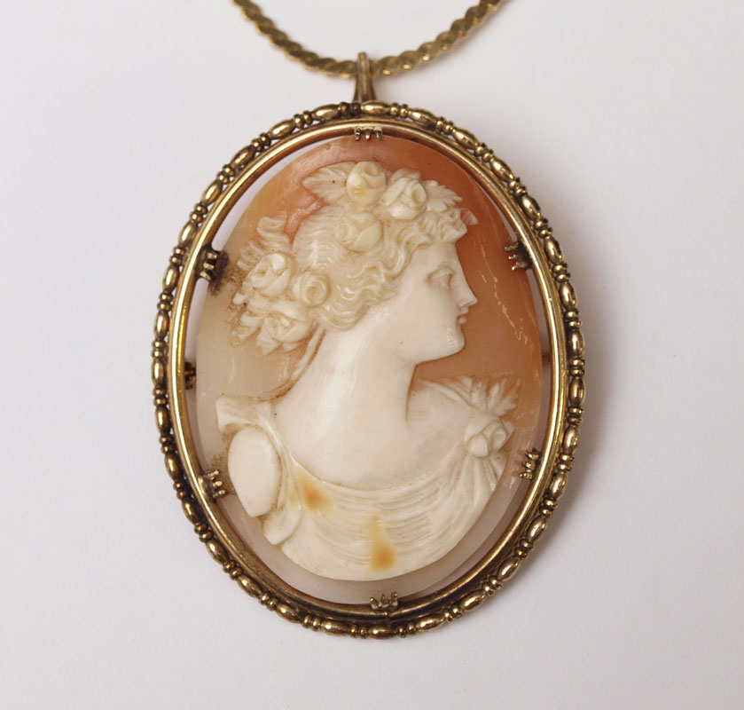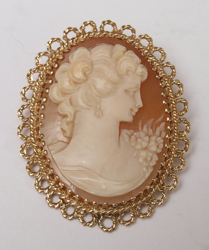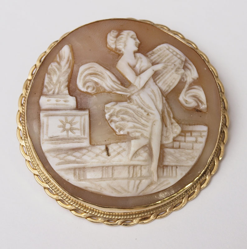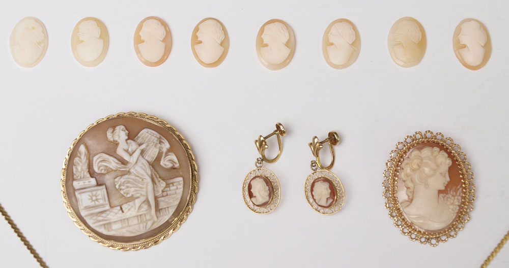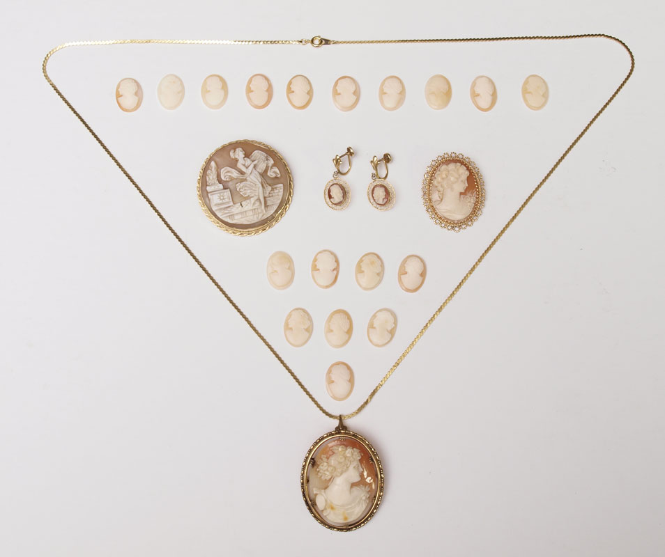 CARVED SHELL CAMEO COLLECTION: To include a 14K framed full figure with lute brooch pendant, 2'' dia. 2 Non gold cameo brooch / pendants with one non-gold chain. Pair of 14K screw back earrings with non gold cameo pendants. And a group of 18 (18.00 X 13.00 mm) loose oval cameos. Gold Weight: 10.0 grams approx.
