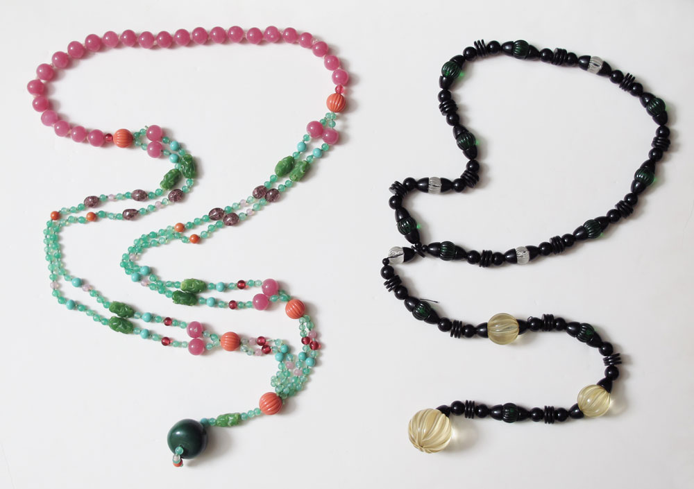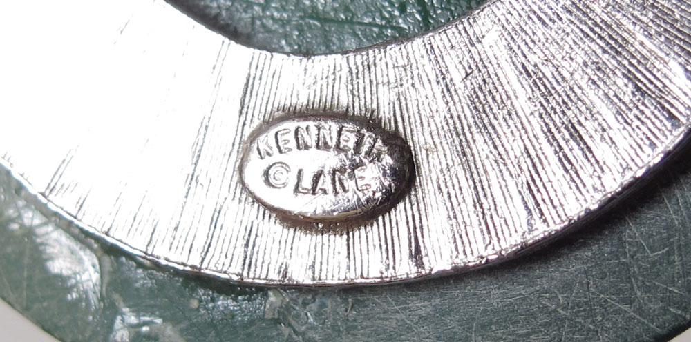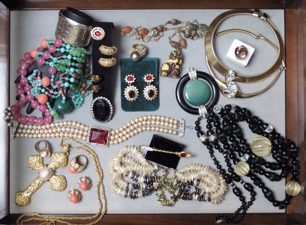 ESTATE ASSORTMENT OF KENNETH J LANE COSTUME JEWELRY: Several different marks - Kenneth Lane with copyright include two faux Diamond chokers; faux Jade, Onyx and rhinestone necklace; faux pearl choker centered by large emerald cut ''ruby''; oriental motif necklace with foo dog pendant; bright gold tone ring set with ''coral'' and rhinestones, internal sizer; simple gold tone clip hoop earrings; wild ''ruby'' ''amethyst'' and ''diamond'' clip dangle earrings; and a pretty little scepter pin. K.J.L. with copyright on one pair of clip earrings set with faux coral and rhinestones in gold tone metal. And three items marked KJL with copyright - ''Hammered'' gold-tone metal clamper bracelet measures 1 3/4''w. opening 2 3/8'' x 2''; faux Angel skin coral bypass ring set with rhinestones in gold tone metal with wear, internal sizer; and large cross set with faux Angel skin coral and rhinestones, 5 1/2'' x 3 1/8'' on a 32'' unmarked gold tone chain. A three strand faux pearl necklace marked KJL on clasp, 17 1/2''l. And a gold tone, white and yellow rhinestone and faux Tahitian pearl ring, internal sizer. Sold with unmarked items to include, two cool bead necklaces; clip gold nugget hoop earrings; a large ''amethyst'' glass stick pin; and round brilliant cut smoky quartz? Gold tone ring. Sold as a lot.