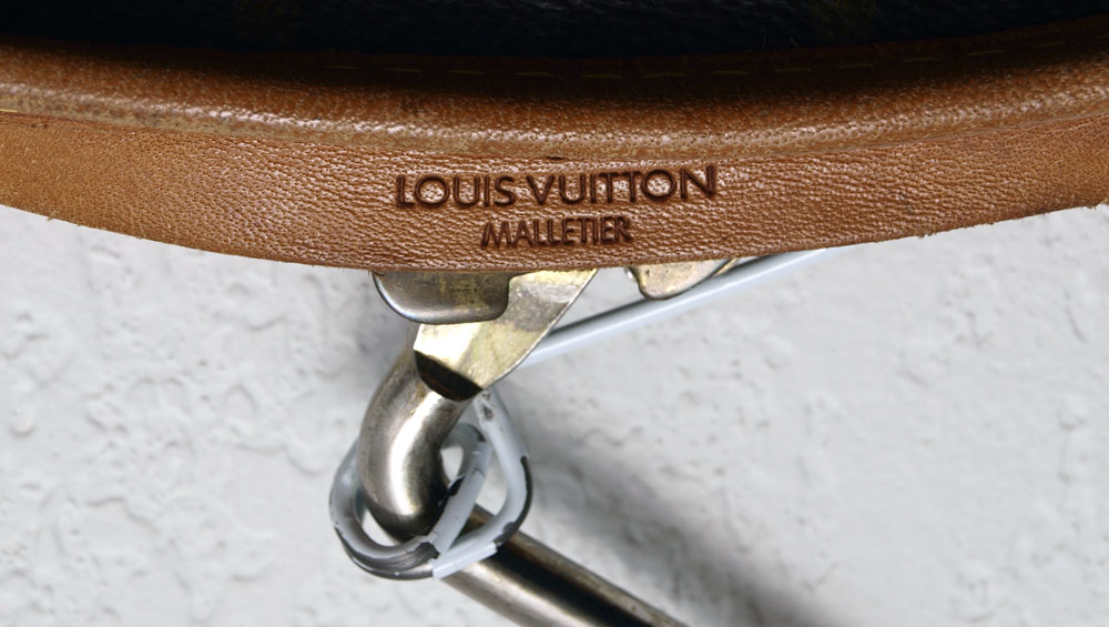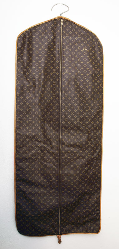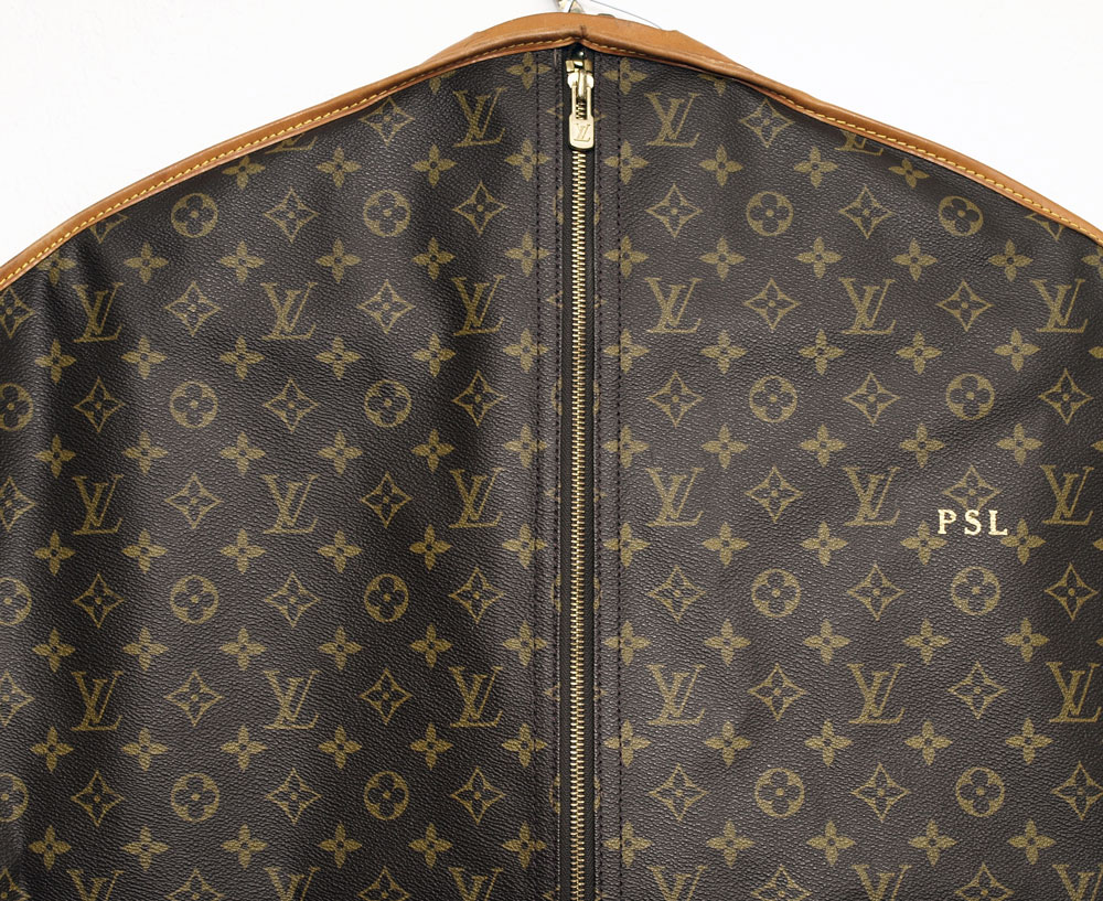 LOUIS VUITTON GARMENT BAG: Logo emblazoned leather bag, full length zipper. With metal hanger. Impressed ''Louis Vuitton Malletier''. Hidden leather number tag 892 FC. Measures approx. 57'' l. x 24''. Very minimal wear. Purchased new approx. 15 years ago at Saks in New York.
