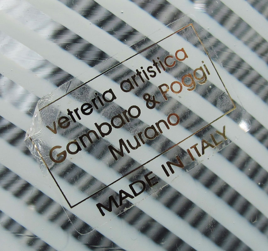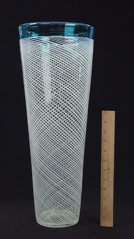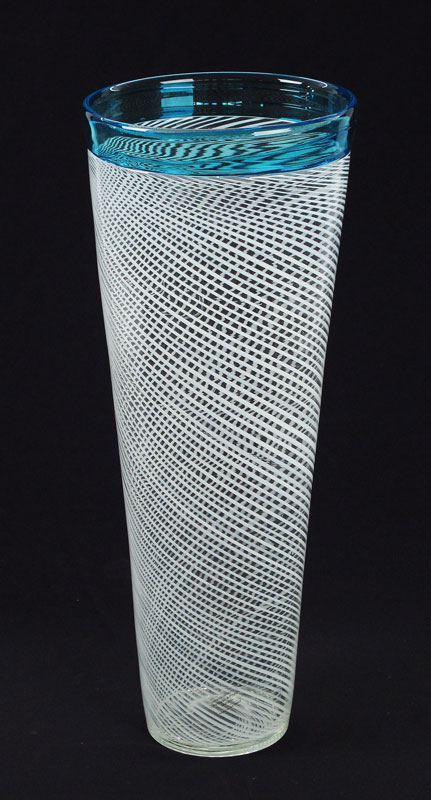 GAMBARO & POGGI MURANO GLASS VASE: Rich aqua color rim over white stripes. Approx. 20 3/4'' tall x 8'' dia. at the widest. Original label sticker.