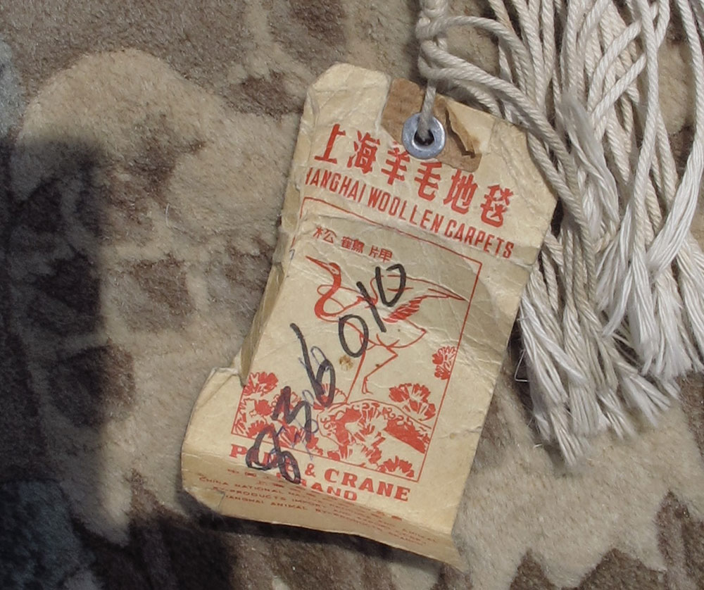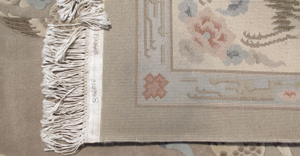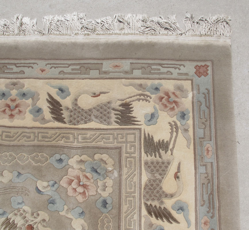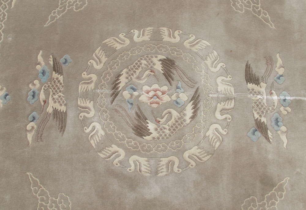 MODERN CHINESE HAND KNOTTED WOOL RUG, 12' x 9': This pretty room size rug has an interesting pattern made up of Imperial cranes in flight. There are four in the center of the rug with a circle of white swans around them. Then there is a larger circle of cranes and clouds on the soft grey field as well as cranes in the corners of the rugs field. The main border has an ivory background where more cranes and clouds are found. The soft palette of this rug would make a great centerpiece for many decorating styles. Condition is good.