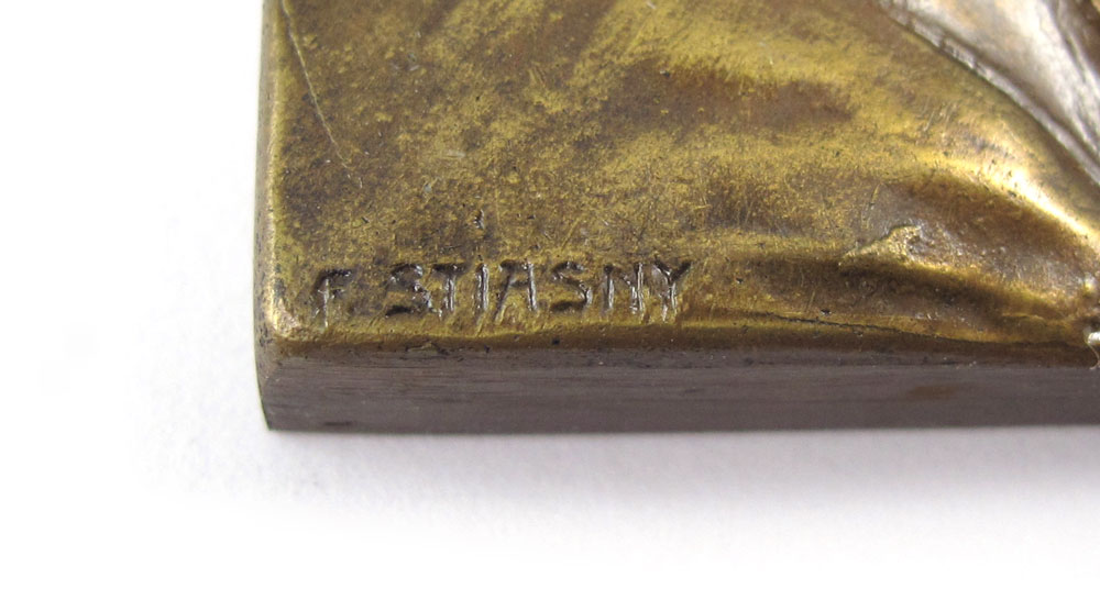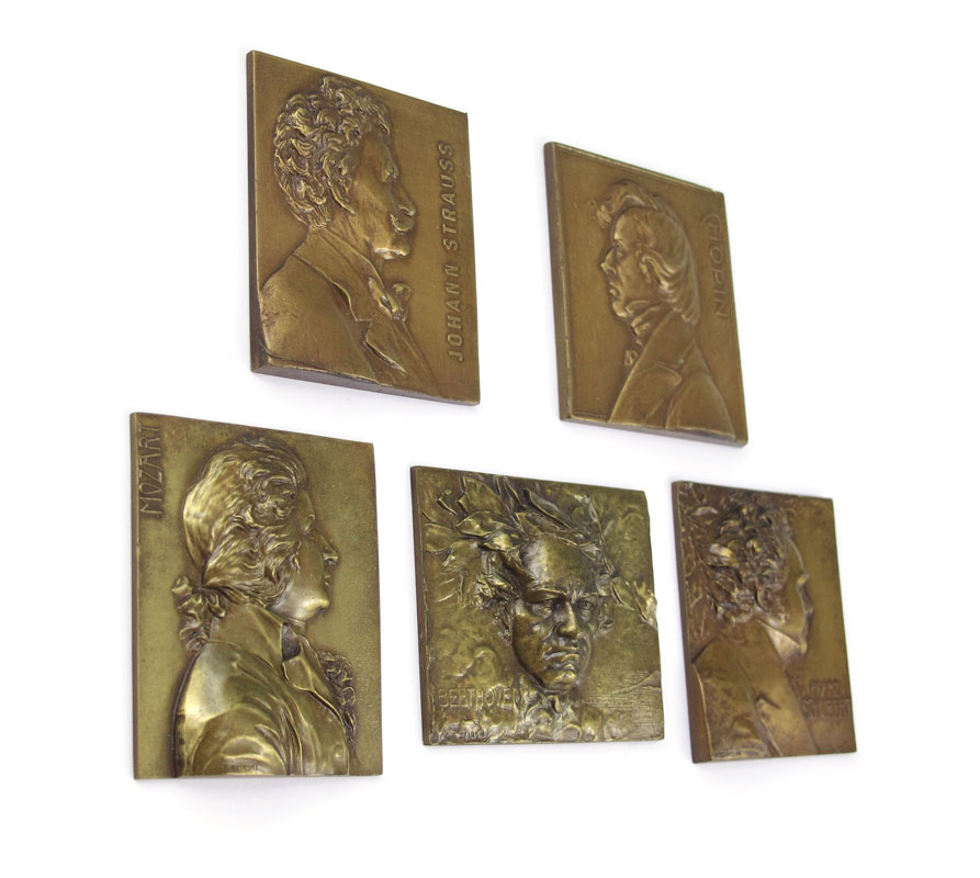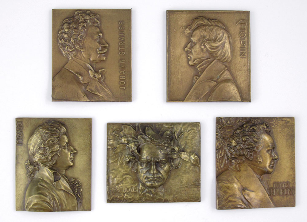 5 FRANZ STIASNY BRONZE PLAQUES HONORING CLASSIC COMPOSERS: Mozart, Chopin, Johann Strauss, Franz, Schubert, and Beethoven. Each approx. 2 1/2'' x 2 ''. The Schubert plaque is signed F. Stiasny.