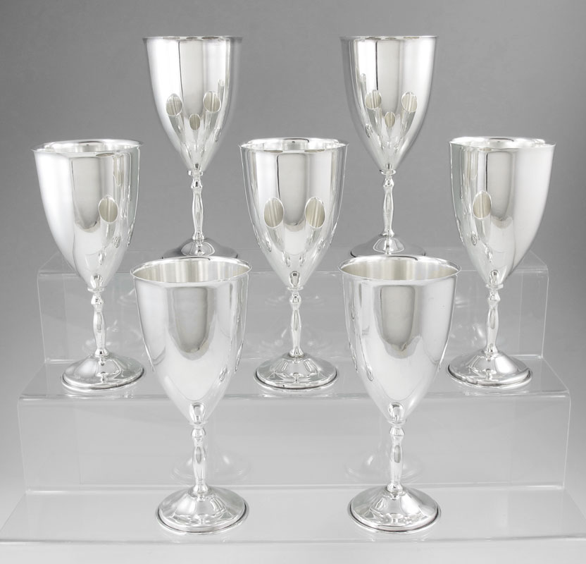 7 MEXICAN STERLING SILVER GOBLETS: All hallmarked with the Eagle 1 bell, CLS, Sterling 925, Hecho in Mexico. 7'' h. x 3 1/8''. Approx. 48 troy oz.