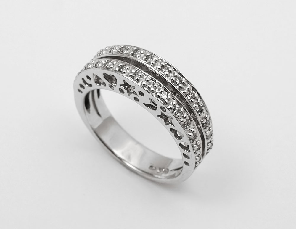DIAMOND BAND RING: 14K white gold moon and star filigree two band style ring. 26 round brilliant cut diamonds total .25 Ct., average VS-SI in clarity and G-H color. Prong set. Size: 6.5. Weight: 5.1 grams. Sold with current Florida Diamond Appraisers GIA graduates appraisal for $1,050.