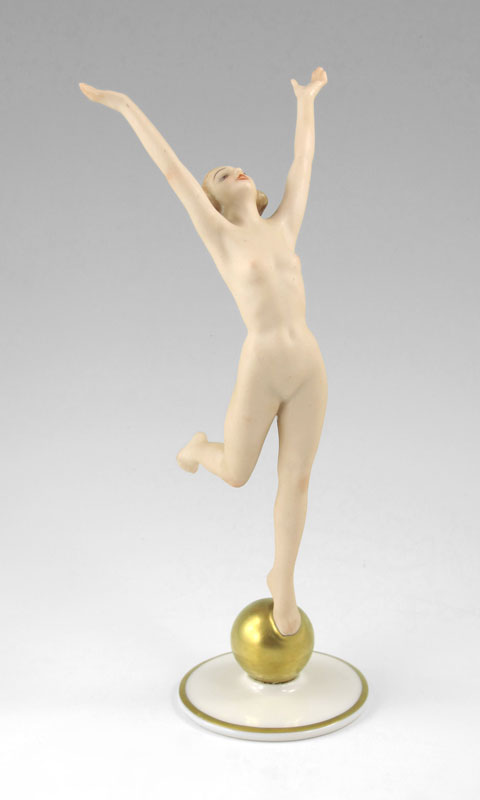 HUTSCHENREUTHER ART DECO NUDE SUN CHILD FIGURE: Fine modeling designed by Karl Tutter. Woman stretching to the sun, standing on a gilt ball. 8 1/2''h.