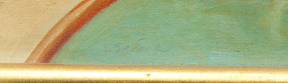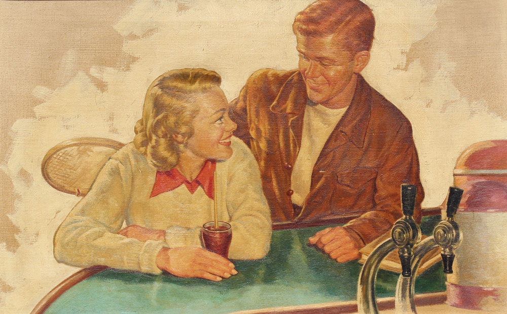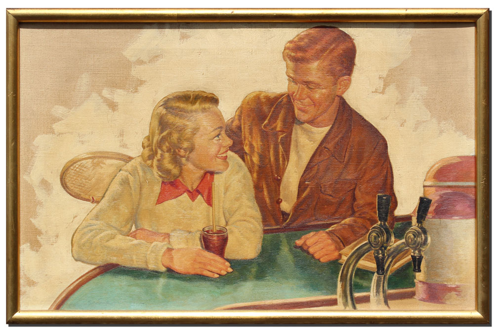 KLEIN, Sandor C., (American 1912-1995): Illustration of a Young Couple sitting at the County Club Bar, Post Tennis Match, Oil/Canvas 16'' x 25'', signed lower left, Sandor, gilded frame with wear, 17 1/2'' x 26 1/2''.