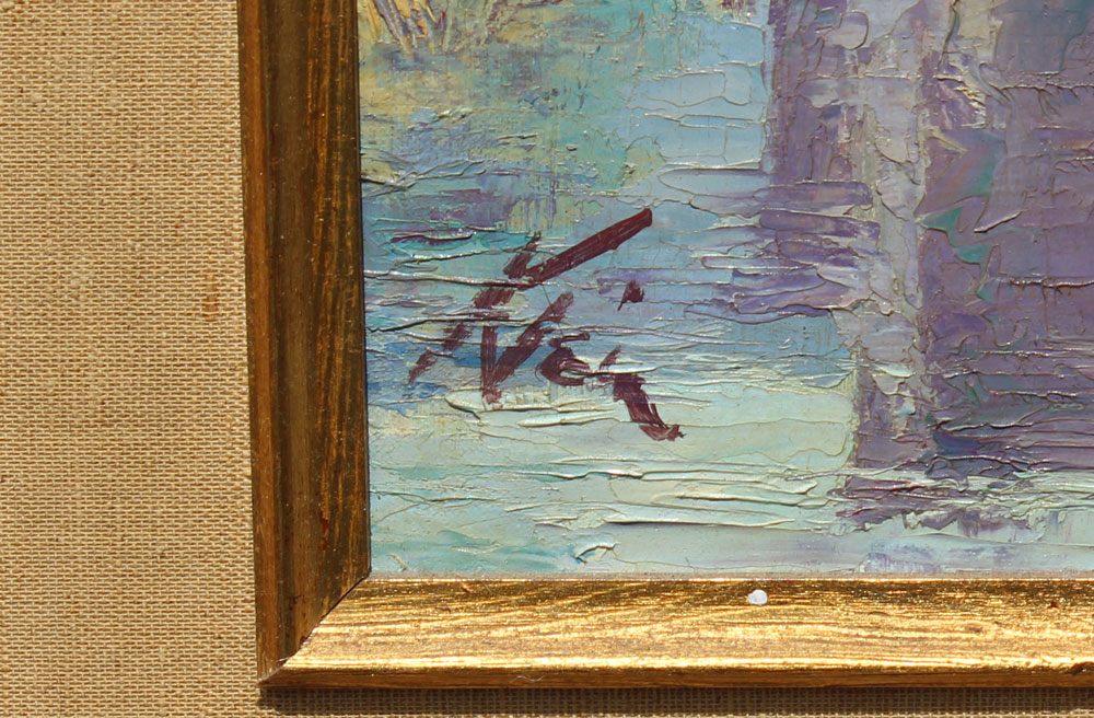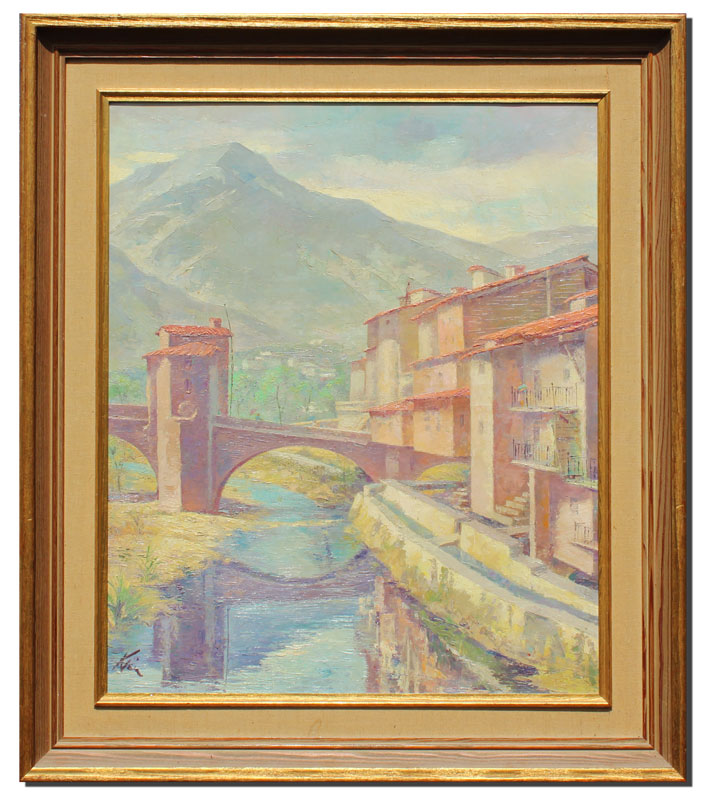 KLEIN, Sandor C., (American 1912-1995): European City on the River with Mountains in the Distance, Oil/Canvas, 24'' x 20'', signed lower left, wooden frame, 30 1/2'' x 26 1/2''.