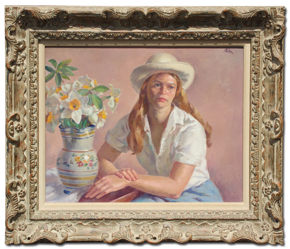 KLEIN, Sandor, C., (American 1912-1995): Portrait of a Young Girl Posing with Flowers in a Vase, Oil/Canvas, 16'' x 20'', signed upper right, encased in pierced carved and finished antique frame, 23'' x 27''.