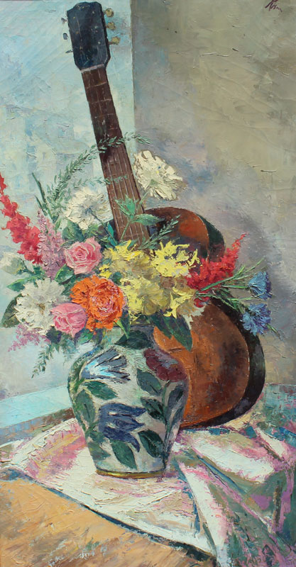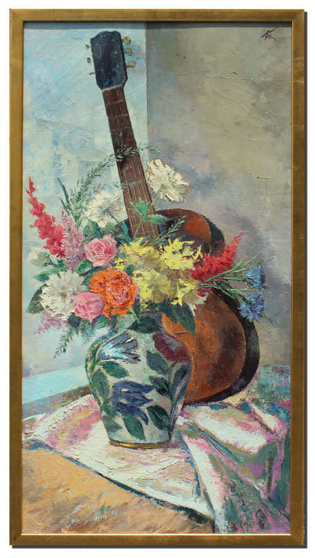 KLEIN, Sandor C., (American 1912-1995): Still Life of Flowers in a Vase with Guitar, Oil/Canvas, 38'' x 20'', gilded frame, 40'' x 22''.