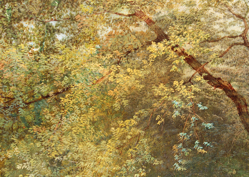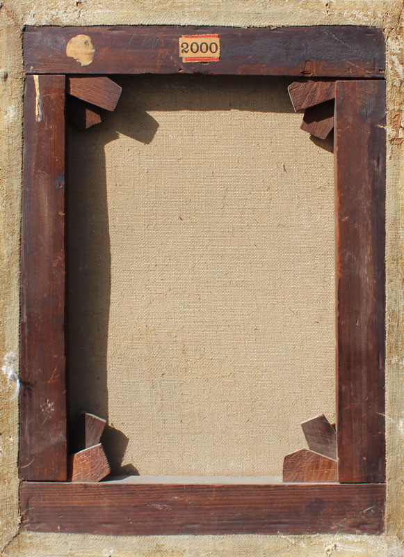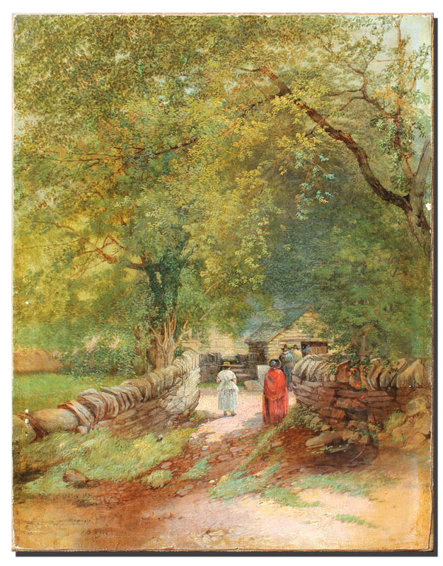 VERY GOOD 19TH CENTURY LANDSCAPE WITH FIGURES POSSIBLY PILGRIMS: OIL/Canvas, 14'' x 11'', illegibly signed lower left, dated 188?, period gesso gilded frame with missing gesso 20'' x 16 1/2''