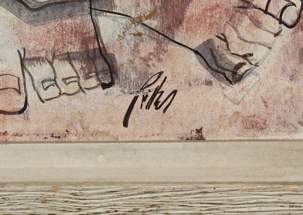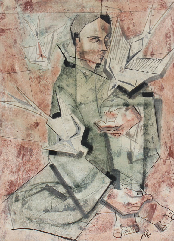 CUBIST MIXED MEDIA ARTWORK OF ST FRANCIS: Watercolor, with pen and ink, 23 1/2'' x 17 3/4'', signed lower right, Ritter period, painted and gilded frame w/wear, 33'' x 27 1/4''.